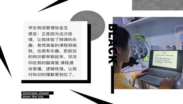 这次疫情,让我体验到了网课的乐趣,老师们准备课程很细致,把前后的知识都串联起来,深深印在了我的脑海里,逻辑性很强,我对课程的理解更到位了。