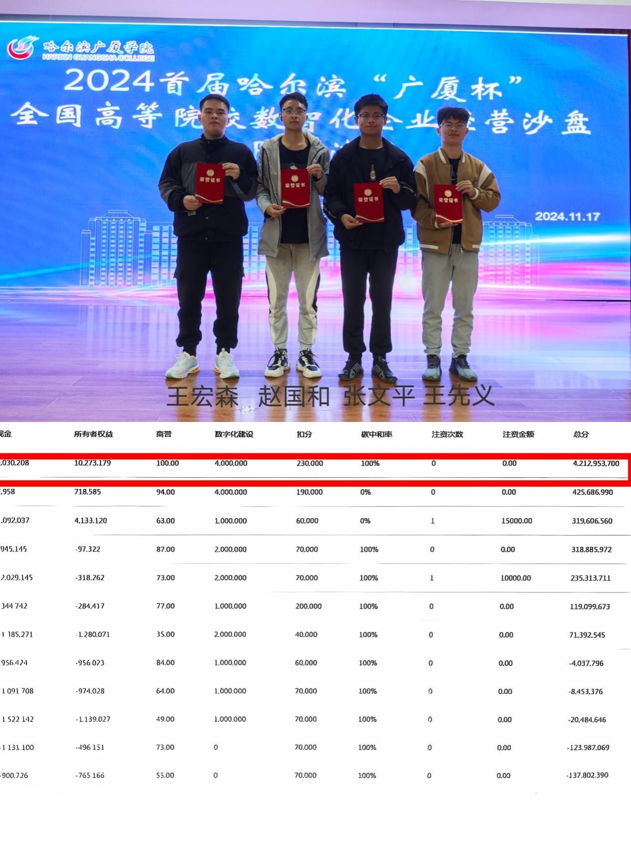11月17日,2024首届哈尔滨“广厦杯”全国高等院校数智化企业经营沙盘交流赛在哈尔滨广厦学院圆满落幕。此次比赛汇集了来自黑龙江省哈尔滨工业大学、哈尔滨工程大学、哈尔滨农业大学、哈尔滨商业大学等40支优秀队伍同台竞技。比赛紧密围绕“龙江数字经济”建设、赋能传统产业转型升级的发展目标和策略,以数智化(即数字化、智能化)为切入点,旨在让不同专业的学生体验完整的数字化、智能化企业经营全过程、全场景,形成正确的数字经济环境下的企业经营思路和管理理念,同时搭建校际、校企间教学交流与共享的平台,推动高等教育内涵式发展。