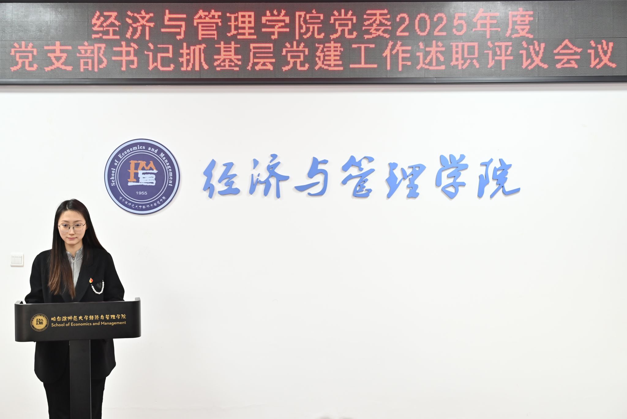 会议第一项,本科生第一党支部书记李金蔚、本科生第二党支部书记龚泳霖、本科生第三党支部书记姬晨毓、本科生第四党支部书记贾涛、本科生第八党支部书记佟瑶、研究生第三党支部书记闫禹、工商管理系教师党支部书记张宝生、经济贸易系教师党支部书记李言睿、经济系教师党支部书记刘生依次述职。各位书记围绕支部政治建设、“三会一课”规范化落实、“党建+育人”模式创新等履职情况,聚焦党建与业务融合不足、特色品牌辨识度不高等问题,明确了下一步支部建设的目标,述职内容详实具体、问题查摆精准务实。学院领导班子以“一述一评”方式逐一点评,既肯定各支部在协同育人、服务奉献等方面的成效,也针对性提出优化改进建议,为支部党建提质增效指明方向。