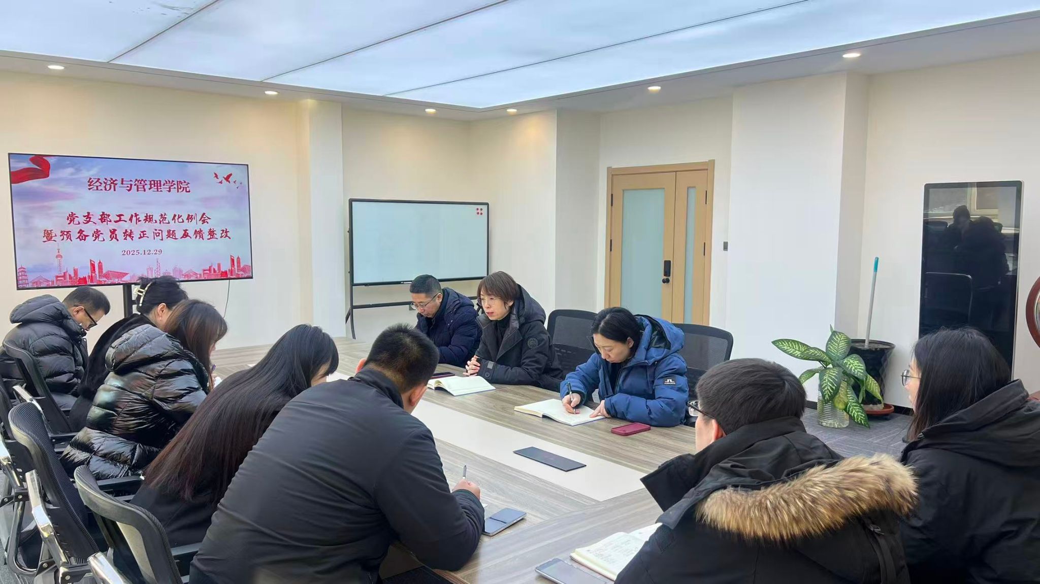 于2025年12月29日上午,召开学生党支部工作规范化例会暨预备党员转正问题反馈整改专题会议。学院全体学生党支部书记及党委组织员毕伟参加,会议由学院党委书记陈莹莹主持。