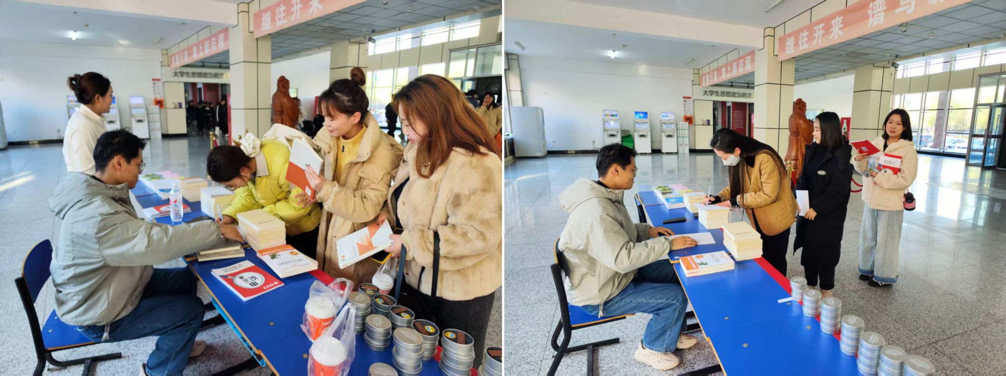 活动当日,党员志愿者提前抵达现场,精心划分并布置捐书区、登记区与书籍整理区,从指引标识到纪念礼物,每一处细节都彰显着暖心考量。活动正式启动后,全院学子踊跃参与,纷纷携带着精心挑选的图书奔赴现场——既有实用易懂的生活百科,能切实解决日常所需;更有启迪智慧的科普读物与农业技术工具书,全方位满足不同群体的阅读需求。志愿者始终面带微笑,耐心为每一位捐书学子办理登记手续,细致讲解活动意义,并递上纪念礼品。现场分工明确、配合默契,往来穿梭的身影、整齐堆放的书籍、温暖真挚的交流,构成了一幅“书香传爱心,青春赴使命”的动人画卷。