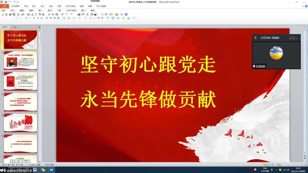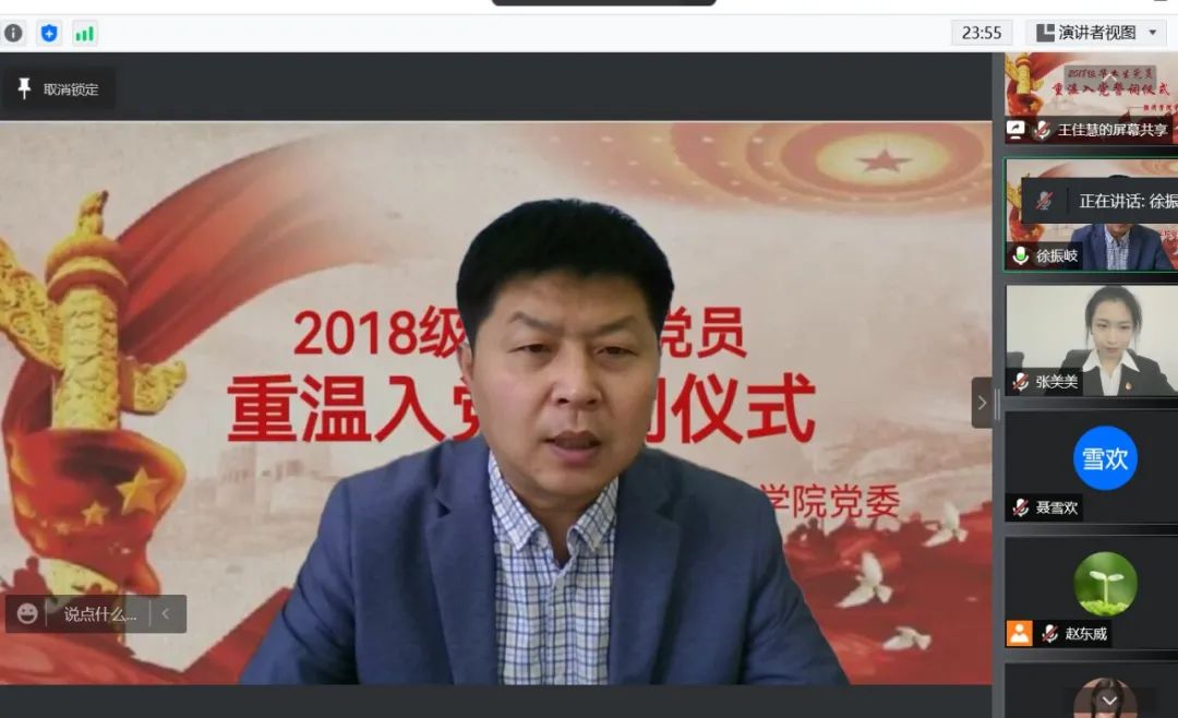 本次活动在庄严的国歌声中拉开序幕,2018级贸易经济专业党员王佳慧代表全体毕业生党员发言,代表经济学院2018级全体毕业生党员作出郑重承诺,在新的学习环境和工作岗位上,2018级全体毕业生党员会继续坚定理想信念,牢记党员身份,发挥党员先锋模范作用,为母校争光,为党旗添彩!在2018级贸易经济专业党员赵美琪的领誓下,2018级全体毕业生党员在云端共同起立,举起右拳,面对屏幕前鲜红的党旗,重温入党时的决心和理想,重拾入党的初心。短短几句誓词,承载着毕业生党员对党、对自己的庄严承诺。学院党委书记徐振岐向毕业生党员表达了殷切希望并以“坚守初心跟党走,永当先锋做贡献”为题讲授毕业前最后一堂特别的党课。他指出重温入党誓词就是希望毕业生党员能够铭记党员的理想信念,增强党员的意识,在走出校园,走向社会后,努力践行党员承诺,始终保持一名党员的先进性,在工作、学习、生活等各方面起先锋模范作用,为身边的人树立学习的榜样。同时要谨记党员的责任与义务,以实际行动践行社会主义核心价值观,增强建设祖国、热爱母校、服务社会和关爱他人的责任感,培养积极进取、奋发图强、感恩母校、感恩祖国、奉献社会的精神,努力成为堪当民族复兴重任的时代新人。