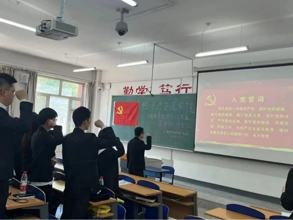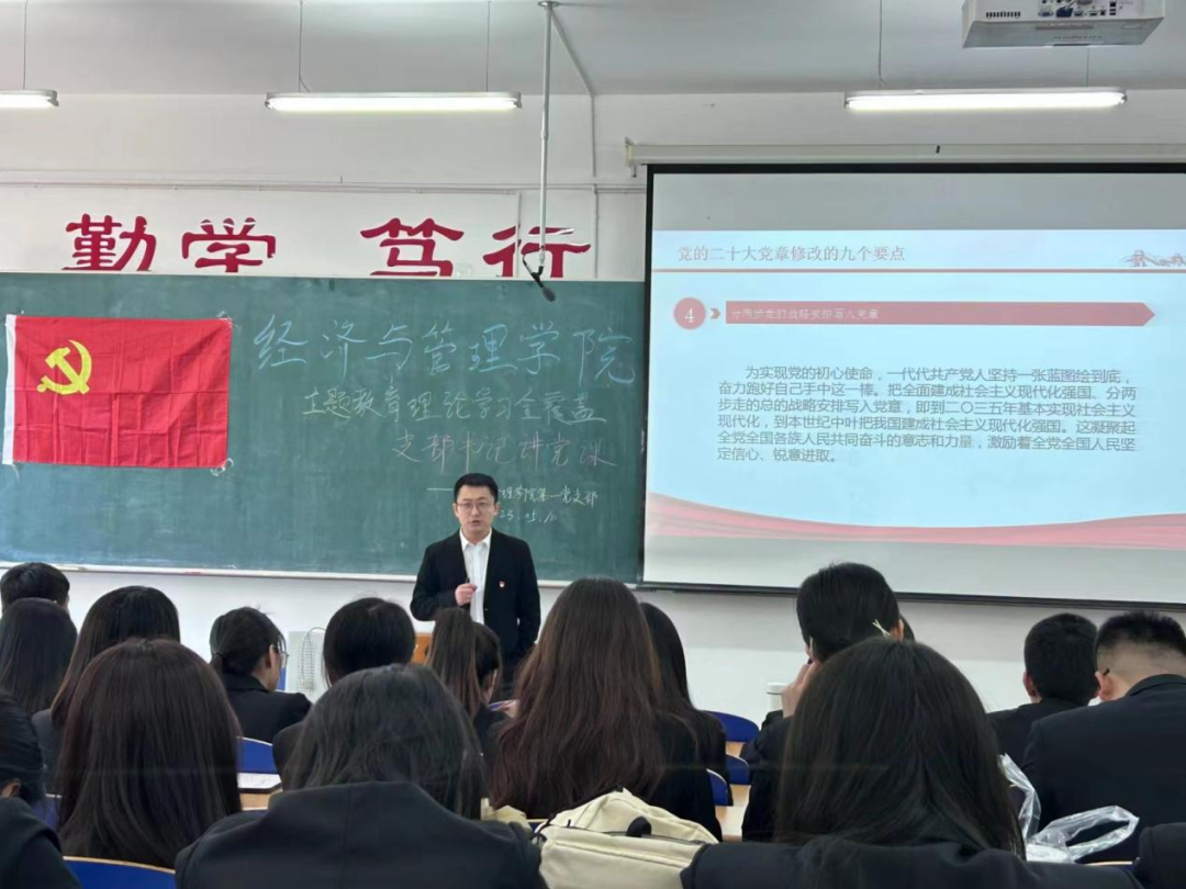 会议伊始,由支部书记徐子恒带领支部全体党员重温入党誓词,通过重温入党誓词使支部党员牢记初心和使命,增强“四个意识”、坚定“四个自信”、做到“两个维护”。会议第二项内容由支部书记徐子恒为大家讲授主题为《党的二十大修改党章的九个要点》的主题党课。通过支部书记的讲授,让学生对修改后的新党章有了更深刻的理解。