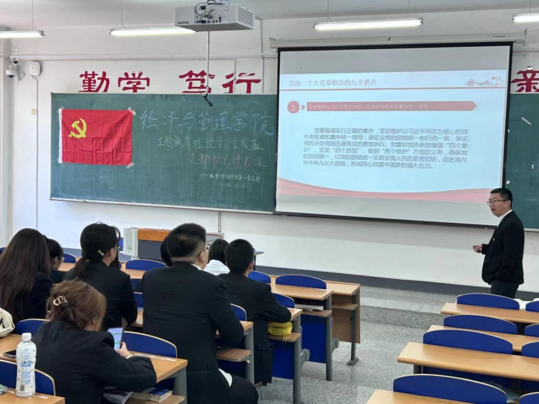 本科生第一党支部开展“党的二十大党章修改的九个要点”主题党课。活动由支部书记徐子恒讲授,支部全体党员参会。