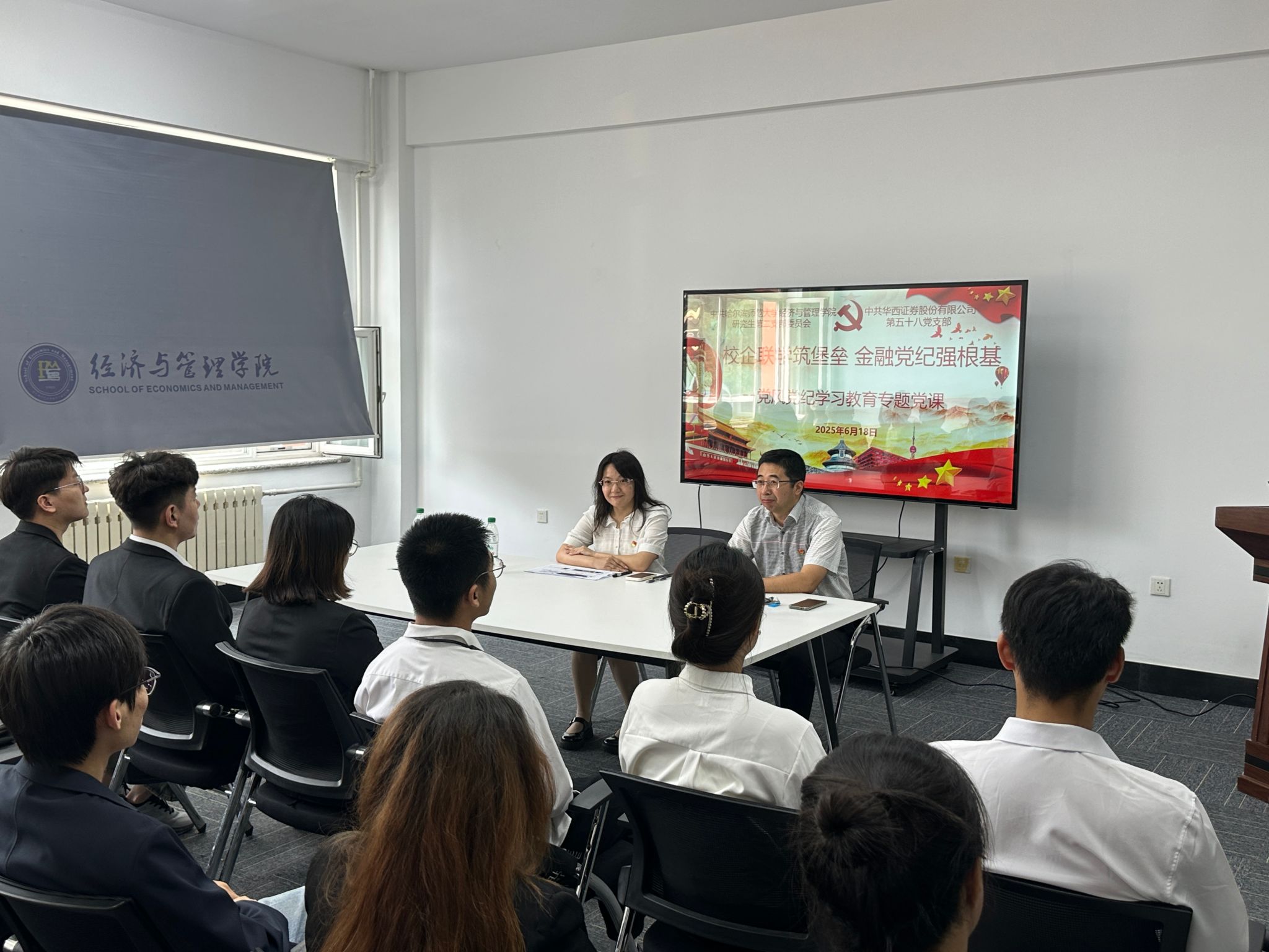 党课伊始,赵东威老师以宏阔的历史视角,深刻阐述党的纪律建设的重要意义。他回溯百年党史,从革命年代的“三大纪律八项注意”,到新时代全面从严治党的纵深推进,生动展现纪律作为党的生命线,始终是党披荆斩棘、不断从一个胜利走向另一个胜利的关键保障。针对金融行业高风险、强关联的特性,赵老师着重强调,从业者严守党风党纪是维护金融市场稳健运行、防范系统性风险的根本所在。对于经管学院研究生而言,在学术研究与职业规划的起步阶段,树立正确的价值观、职业观,锤炼严谨学术态度与高尚职业道德,筑牢纪律意识和底线思维,更是关乎个人长远发展与行业健康生态的重要课题。