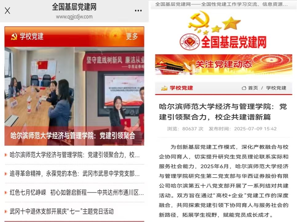 研究生第二党支部与华西证券股份有限公司哈尔滨第五十八党支部开展的系列校企党建共建活动,喜获全国基层党建网学校党建专题报道!