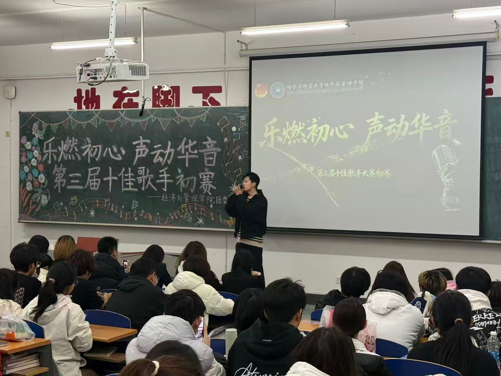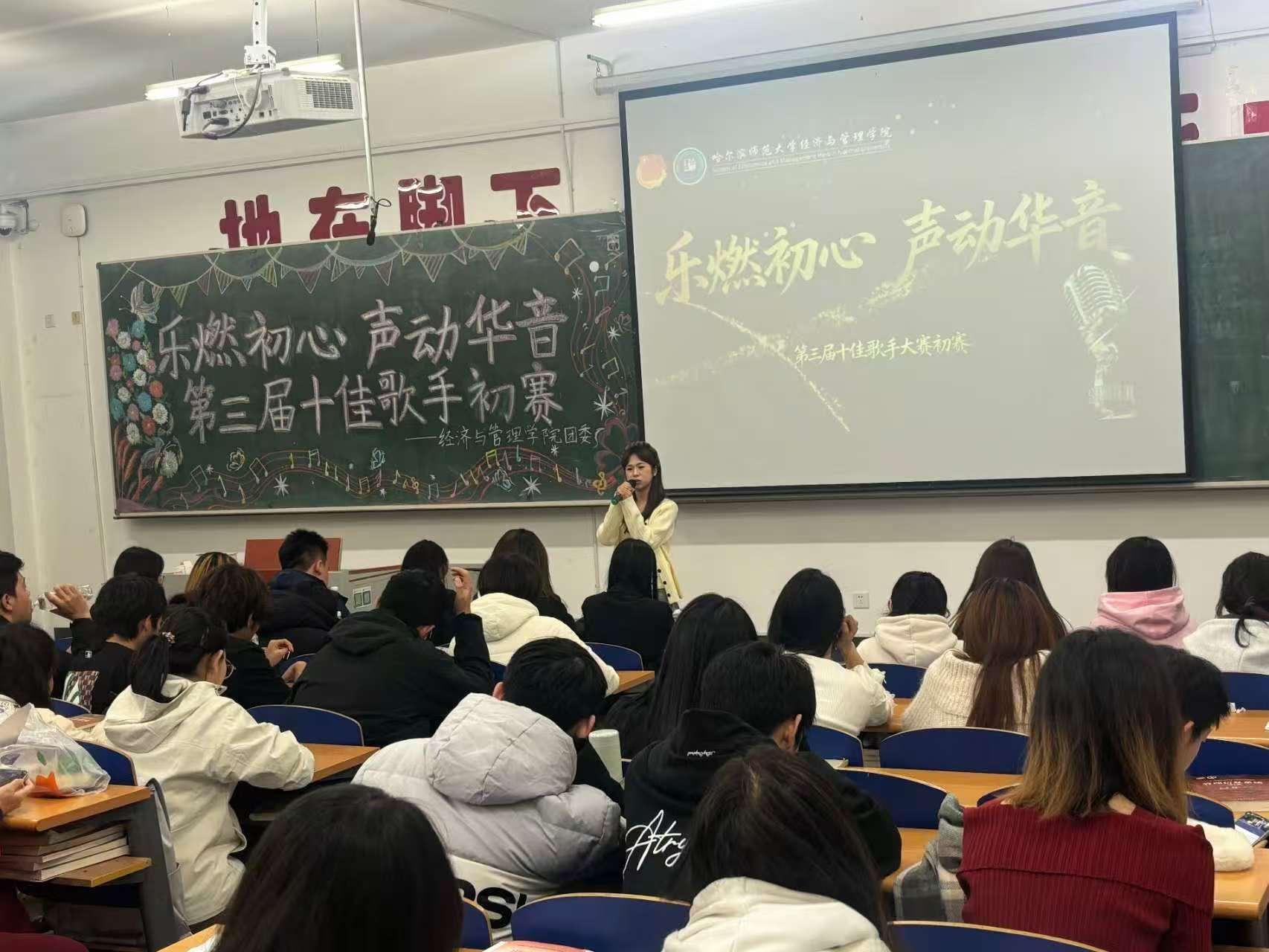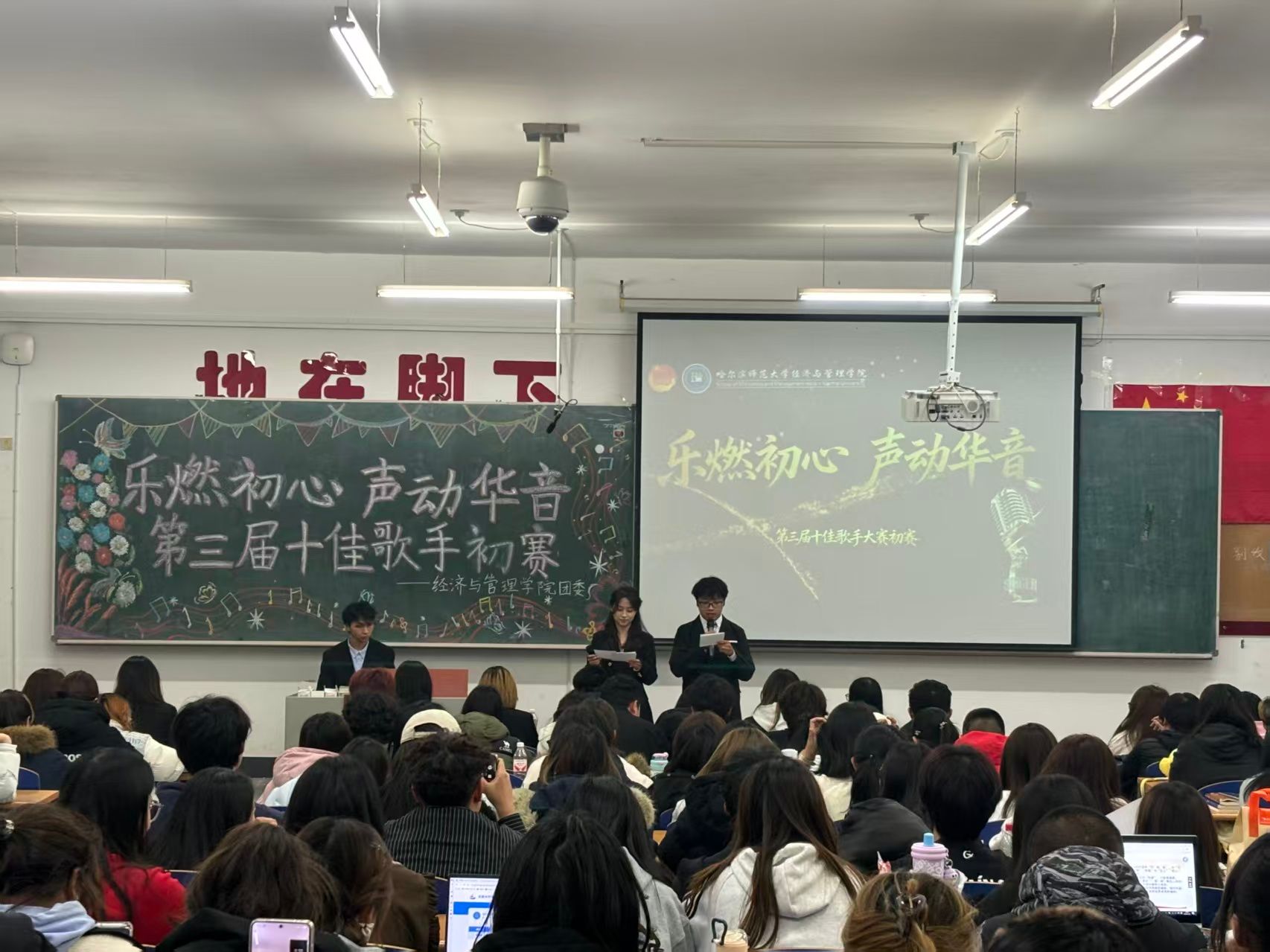 于11月6日在崇师楼D205举办第三届“乐燃初心,声动华音”十佳歌手大赛初赛。赛前学院利用各种平台广泛宣传动员,为全体同学搭建展示自我的舞台,共吸引52名学生踊跃报名,尽显学院浓厚文艺氛围与学子昂扬青春活力。本次初赛由学院第二届十佳歌手大赛冠军陈宏博、亚军吕晓盈、季军赵文瑞担任评委。