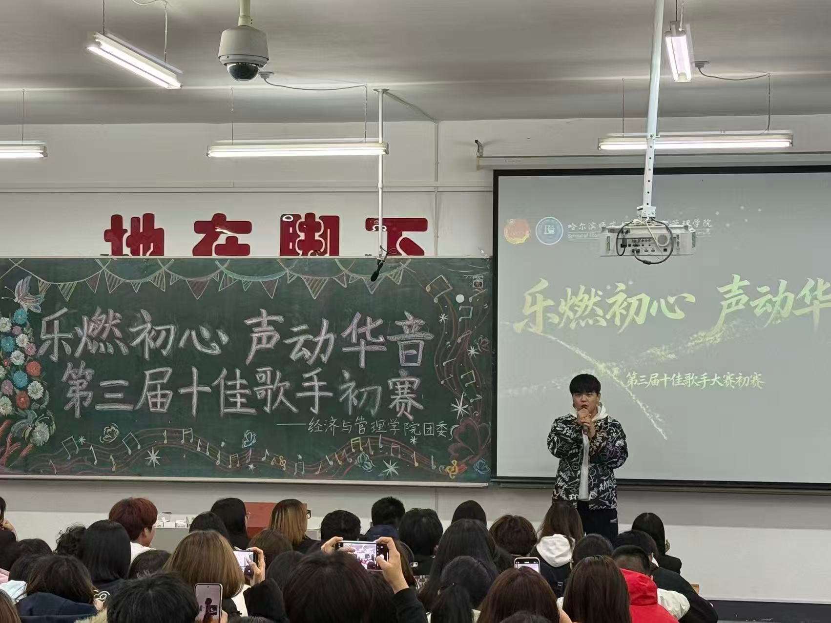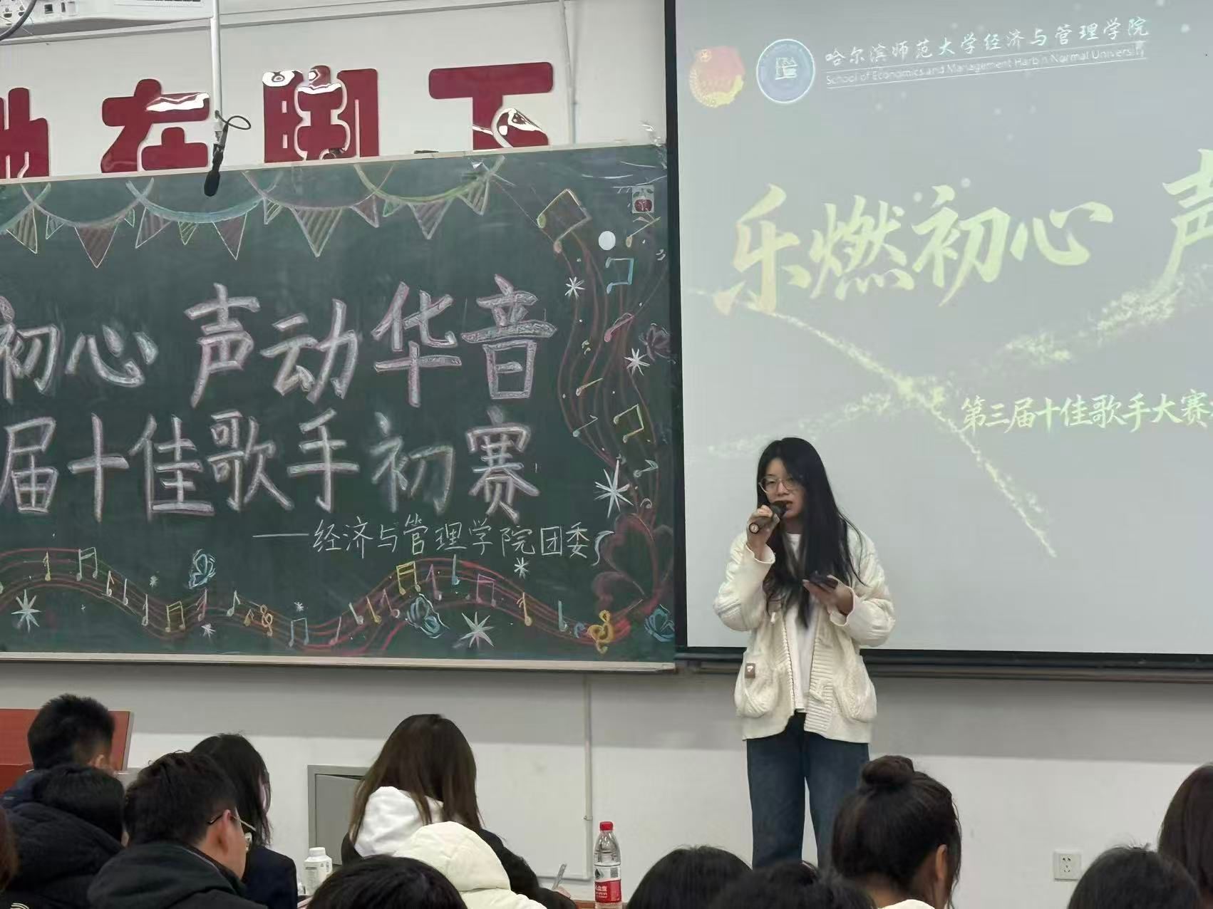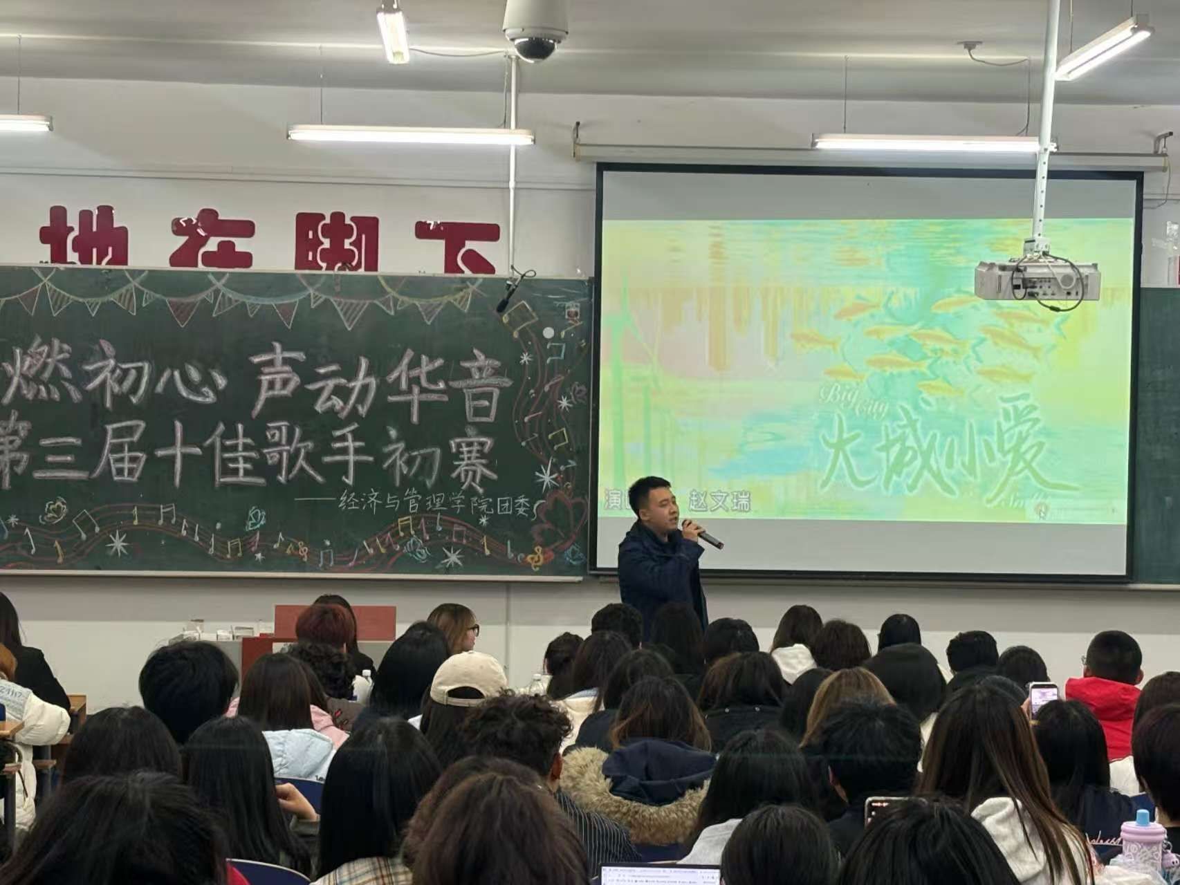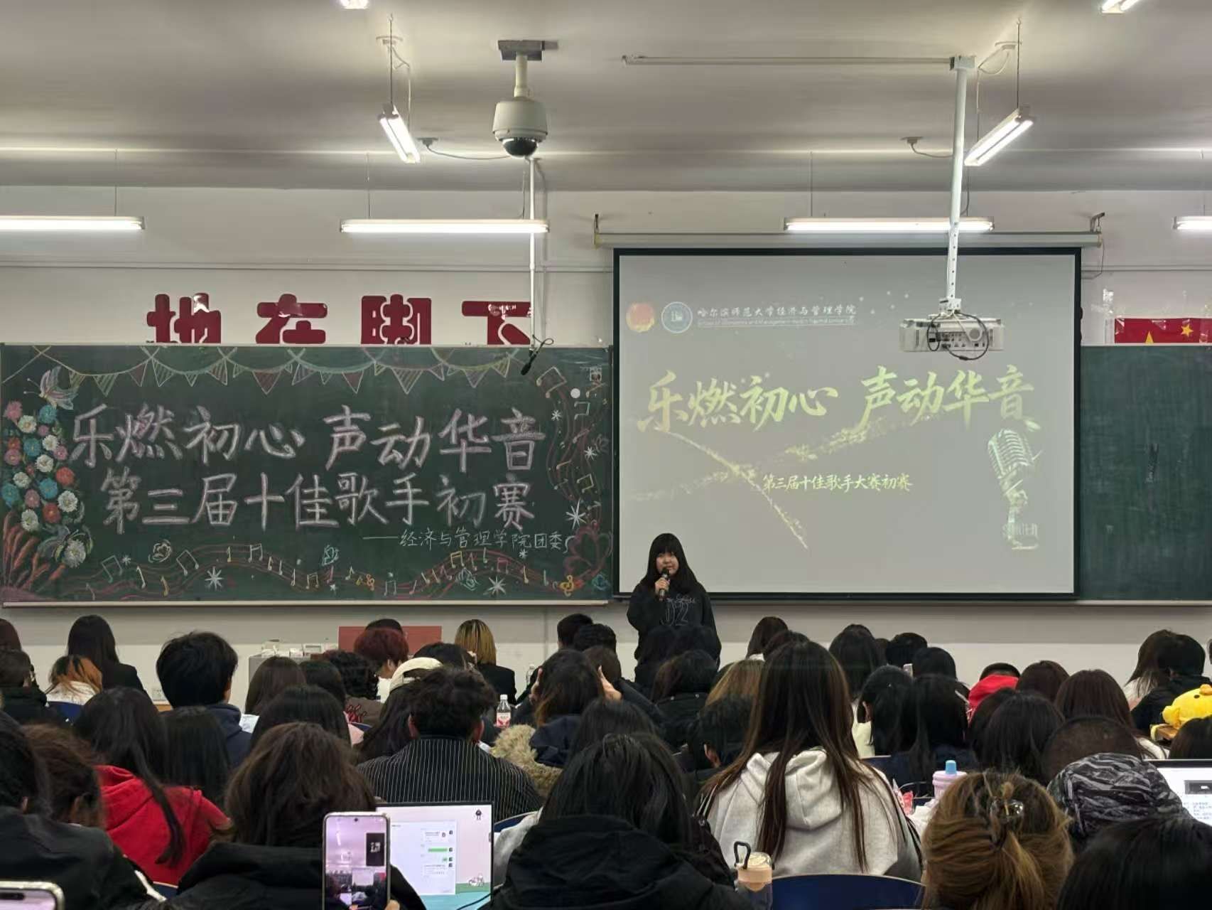 于11月6日在崇师楼D205举办第三届“乐燃初心,声动华音”十佳歌手大赛初赛。赛前学院利用各种平台广泛宣传动员,为全体同学搭建展示自我的舞台,共吸引52名学生踊跃报名,尽显学院浓厚文艺氛围与学子昂扬青春活力。本次初赛由学院第二届十佳歌手大赛冠军陈宏博、亚军吕晓盈、季军赵文瑞担任评委。