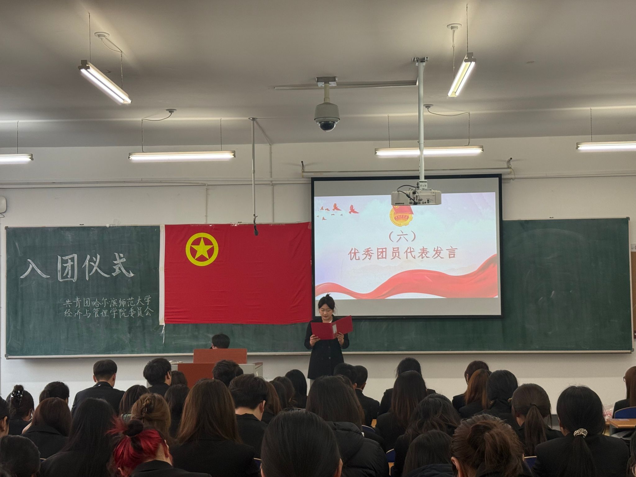 仪式第六项,优秀团员代表武小惟发言。她结合自身实际,勉励新团员以身边先锋为榜样,勇于承担社会责任,为团组织的发展贡献青春力量。
