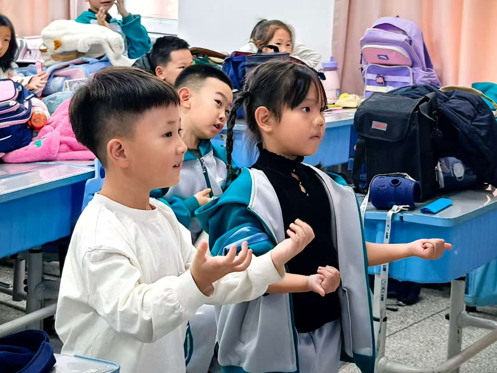 稚嫩童声清甜婉转,灵动手势轻盈舒展,师生携手演绎了一场满溢童真的手势舞盛宴。孩子们踏着欢快旋律抬手、转身、律动,在耳熟能详的曲调中品味文字韵律,将美好意象深植心间。他们鼓足勇气、落落大方地登台展示,在师生协作与同伴互助中,不仅学会了勇敢表达自我,更深谙默契配合的真谛。在老师们眼中,每一个舒展的手势、每一次纯粹的微笑,都是孩子们对“美”最本真的感知与鲜活表达。
