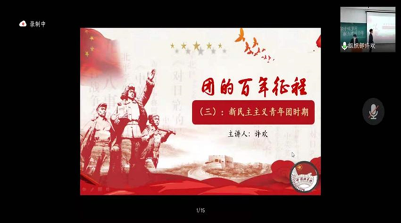 本次活动在庄严的团歌声中拉开序幕,首先由学生干部带领大家重温入团誓词,青年团员们面对鲜艳的中国共产主义青年团旗,高举右手,紧握右拳,庄严宣誓,表明将遵守团的章程,履行团的义务,严守团的纪律,以一名优秀团员的标准严格要求自己,为共产主义事业而奋斗。紧接着,鲍昱同学讲述了两位英雄邓中夏、游曦的故事,她提到青年学生应当传承先辈的爱国主义精神,把先辈们作为学习榜样,勇于拼搏、敢于挑战,勇担责任、砥砺前行。随后,学生代表就百年团史进行理论宣讲,详细介绍了共青团的百年峥嵘岁月,中国共产主义青年团在革命的风暴中光荣诞生,在战斗的历程中发展壮大,在社会变革的洪流中锻炼成长,在改革开放的征途上奋勇前进。一百年栉风沐雨,共青团始终坚定不移跟党走,团结带领共青团员和广大青年前仆后继,勇当先锋,充分展现了党的助手和后备军的担当。