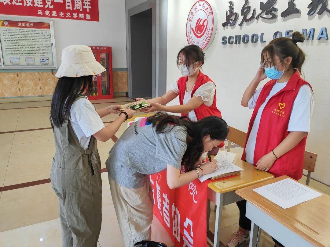 活动开始前,志愿者们提前到达现场,进行现场布置——准备登记表、摆放赠送的小礼品等。活动中,同学们积极参与,捐书捐物。志愿者们有序分工,对同学们所捐赠的物品进行分类整理,将捐赠物品同学进行记录登记后,给捐赠物品的同学们分发礼品。活动最后,志愿者们将同学们捐赠的物品进行分类打包后,统一送到捐赠地点。指导老师对志愿者们进行鼓励并合影留念。