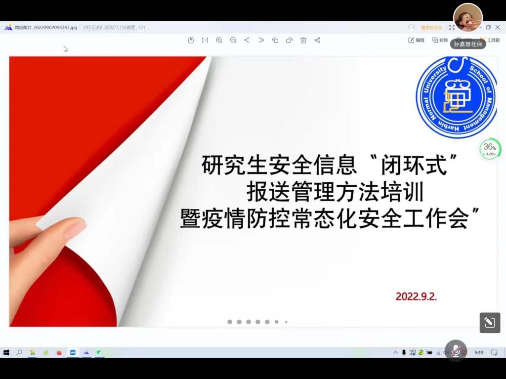 为贯彻落实学校2022年工作要点,深入推进“112349”思想政治教育模式探索,强化安全信息闭环报送机制,使2022级新同学能更好地适应研究生生活,更明确了解安全信息闭环报送流程,积极配合疫情防控常态化的需要,管理学院研究生教务秘书兼研究生辅导员张宇担任主讲,全院研究生参加培训。