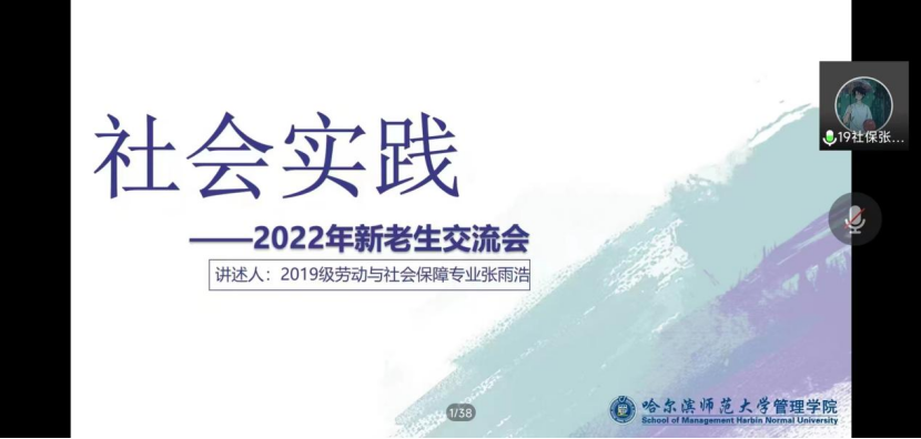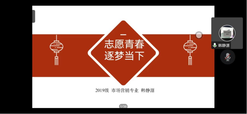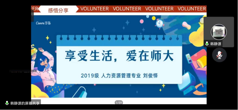 最后,韩静源作为管理学院第十四届学生会副主席,向大家分享了自己的志愿服务经历。他首先介绍了自己参加社会实践的一些经验,从学校到家乡,从校庆志愿者到防疫志愿者,志愿服务不仅是一个身份、一个名号,更是一种责任,大学生应该保持积极向上的精神面貌,做一个博爱进取、乐于助人、无私奉献的优秀青年。