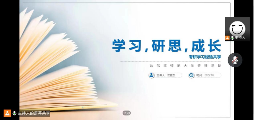 管理学院第十三届团委组织部部长,2022级行政管理专业研究生左佳加从考研流程、考研信息和自身考研经验三方面向同学们做出分享。她强调不管是日常学习还是考研,都要有一个明确清晰的目标,既要为之坚定奋斗,又要适度放松,学会兼顾学习和生活,在研思中不断成长进步。