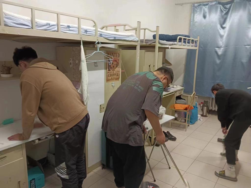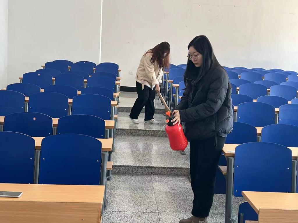 学生在学院领导和辅导员老师的组织带领下,开展了集学生宿舍消杀内务整理、教室清扫消杀和校园分担区清扫于一体的劳动教育实践活动。