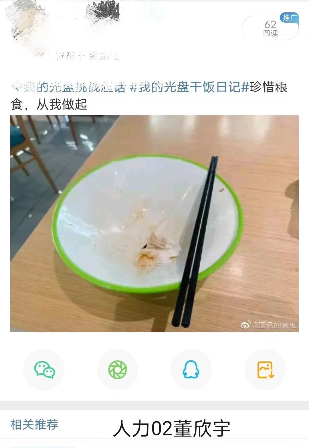 各支部团支书组织动员全体同学积极参加线上微博话题互动讨论,同学们热情响应,积极转发相关话题,并参与了校团委组织的微博打卡接力活动。同学们以实际行动表明将传承和弘扬中华民族艰苦奋斗、勤俭节约的优良传统,思一粥一饭来之不易,念半丝半缕物力维艰。