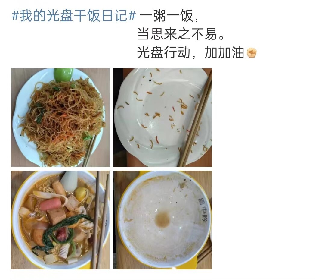 举办了“晒出我的光盘”摄影作品征集活动,号召全体学生拍摄用餐前后的照片,记录自己的光盘行动。广大青年学子积极响应,纷纷表示会把勤俭节约根植于心,使光盘行动成为自觉,真正把节约粮食的口号落到实处。美好“食”光,由你我共创!