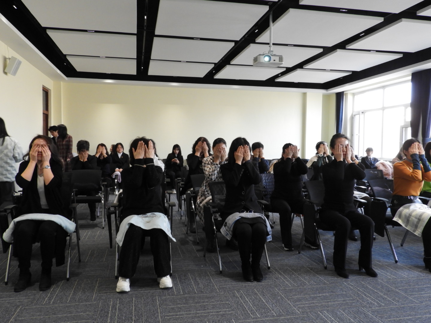 伴随着美妙的音乐和瑜伽教练轻柔的讲解,各位女教师逐渐放松身心,跟随瑜伽课教练逐渐进入状态,全身心地投入到瑜伽培训之中。在瑜伽教练的详细讲解和细致示范中,女教师们循序渐进地学习了一些在办公室座位上就能够简单操作的舒展双臂、肩颈、脊柱等上半身躯体的常用动作,再配合呼吸、冥想放松减压,取得了愉悦身心、舒缓压力的良好效果。