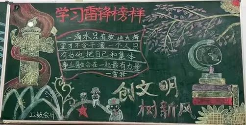 雷锋精神永相传,聚力践行二十大。通过此次板报绘画活动,使全体师生深深地体会到“学雷锋”应把雷锋精神运用和贯穿到自己的日常生活中,传承雷锋精神,塑造美好人格。此次活动不仅推动了学院精神文明建设,更为校园文化增添了一道亮丽的风景线。