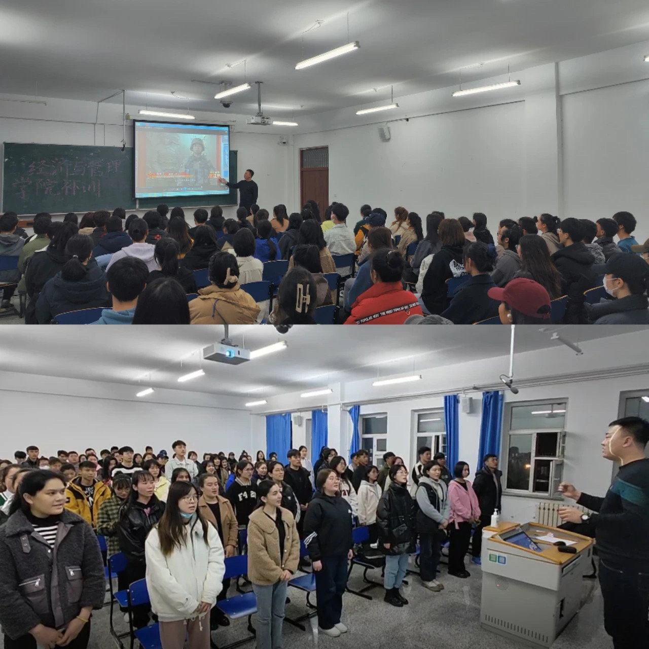 2023年3月9日19点,经管学院全体军训缓训的2021级和2022级学生在崇师楼A624开展学唱军歌活动,并观了看国防视频。在2022级辅导员金东旭老师的带领下,同学们全情投入,激情澎湃,共同学唱了《强军战歌》,以歌声传递了革命军人的战斗精神和革命精神,并通过观看军训题材视频受到了极大地教育和鼓舞。