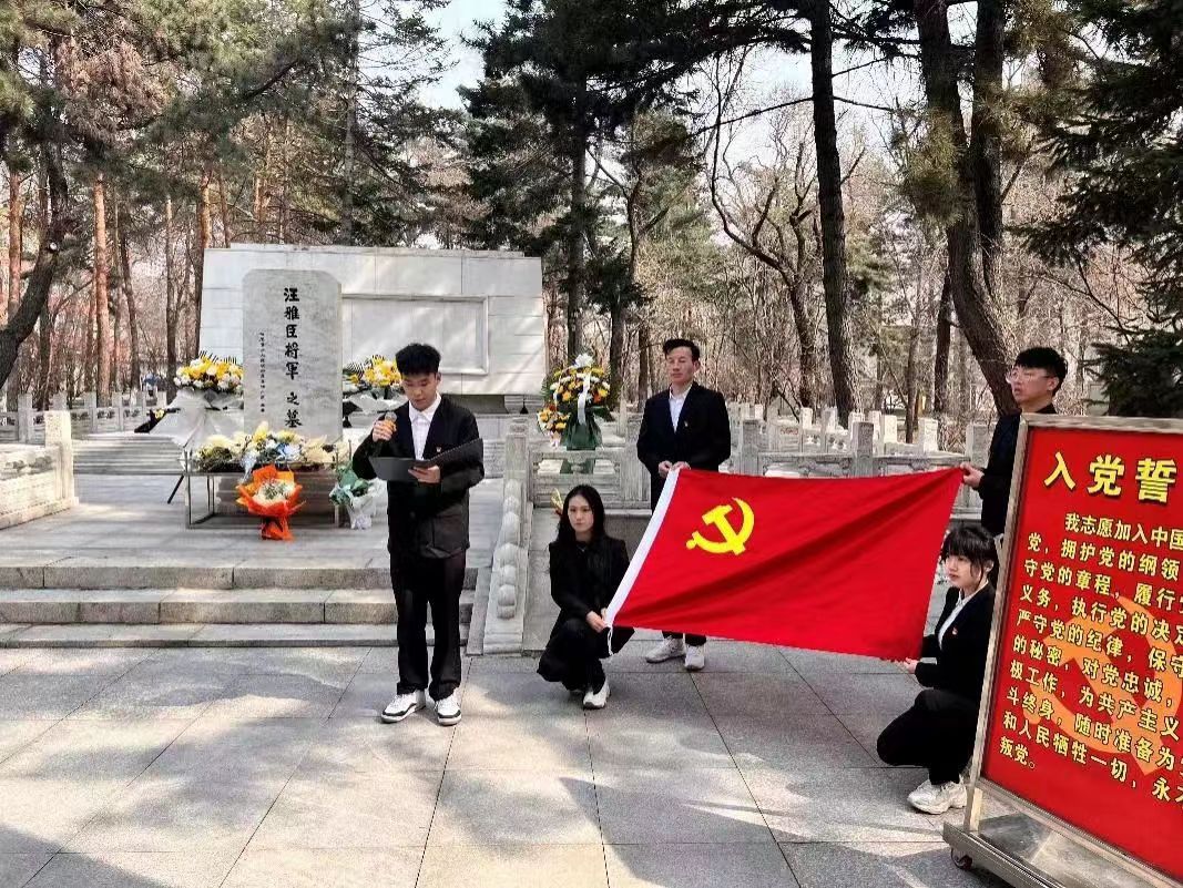 随后,全体师生来到汪雅臣将军纪念碑前,全体党员庄严举起右拳面向党旗,重温入党誓词,声音铿锵有力,彰显初心使命。