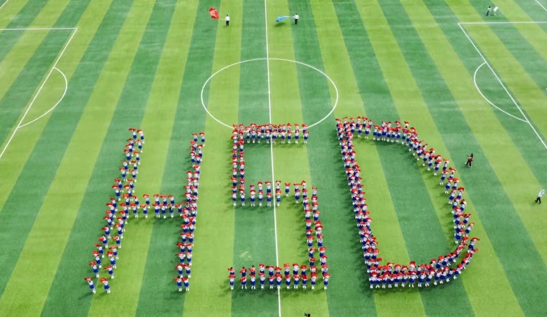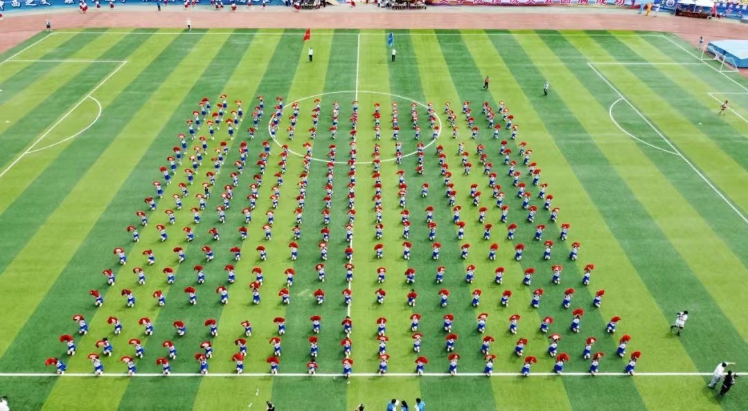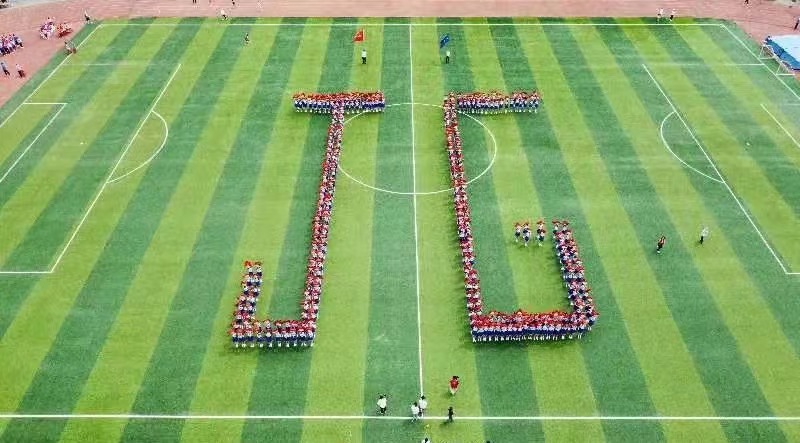 “聚是一团火,散是满天星”,理想之光乍现,内心的火炬已被点燃。此时,同学们已回归方阵队形,蓄势待发,斗志昂扬,一幕幕绚丽如火的图案即将呈现。看!队员们拿着火红的折扇,队形从“中国”到“HSD”再到“JG”……这多变艳丽的扇形阵容宛如大海之滨萌动破土的新芽,更犹如那春潮之后含苞欲放的蓓蕾。