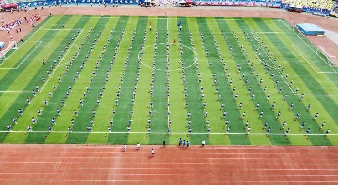 伴随着《你要跳舞吗》音乐响起,同学们在青春的律动声中调整列队。生命如歌,运动似火。瞧!同学们轻快优美的身姿是绿茵场上最耀眼的新星,这是火热的生命,是燃烧的激情。骄阳正好,风过林梢,300个跳动的音符在阳光下雀跃,展开奋飞的翅膀,向着明天,向着未来,挥洒着他们的青年梦、师大梦、中国梦!