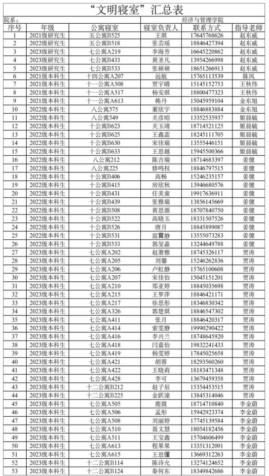 共计评选出以下53间“文明寝室”: