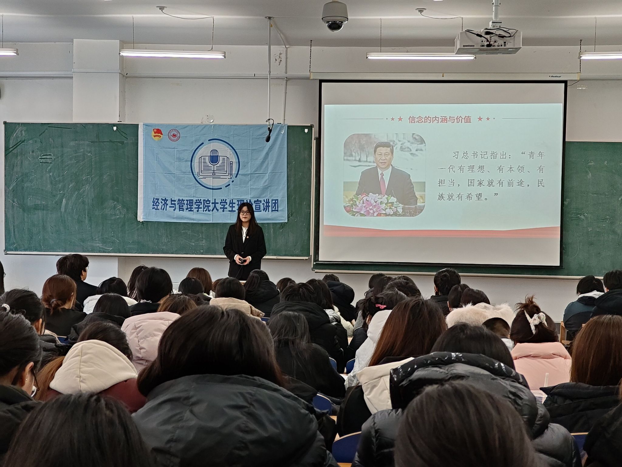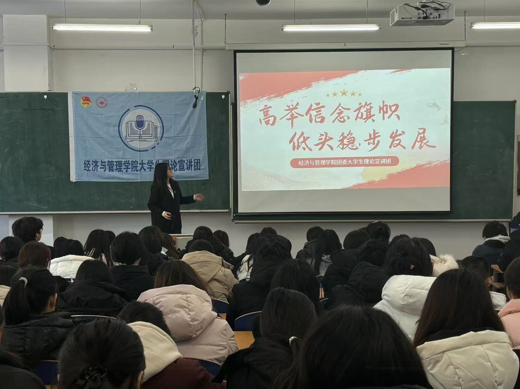 于2024年12月11日在崇师楼C206开展“高举信念旗帜,低头稳步发展”理论宣讲活动。本次活动由学院理论宣讲团成员王妍主讲,各专业学生代表共120人参加本次活动。