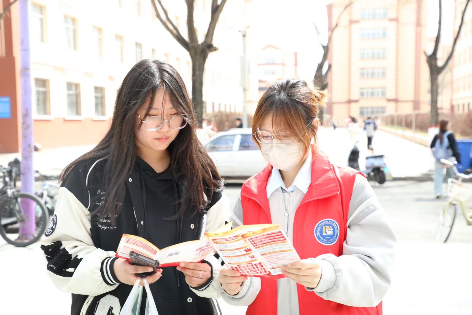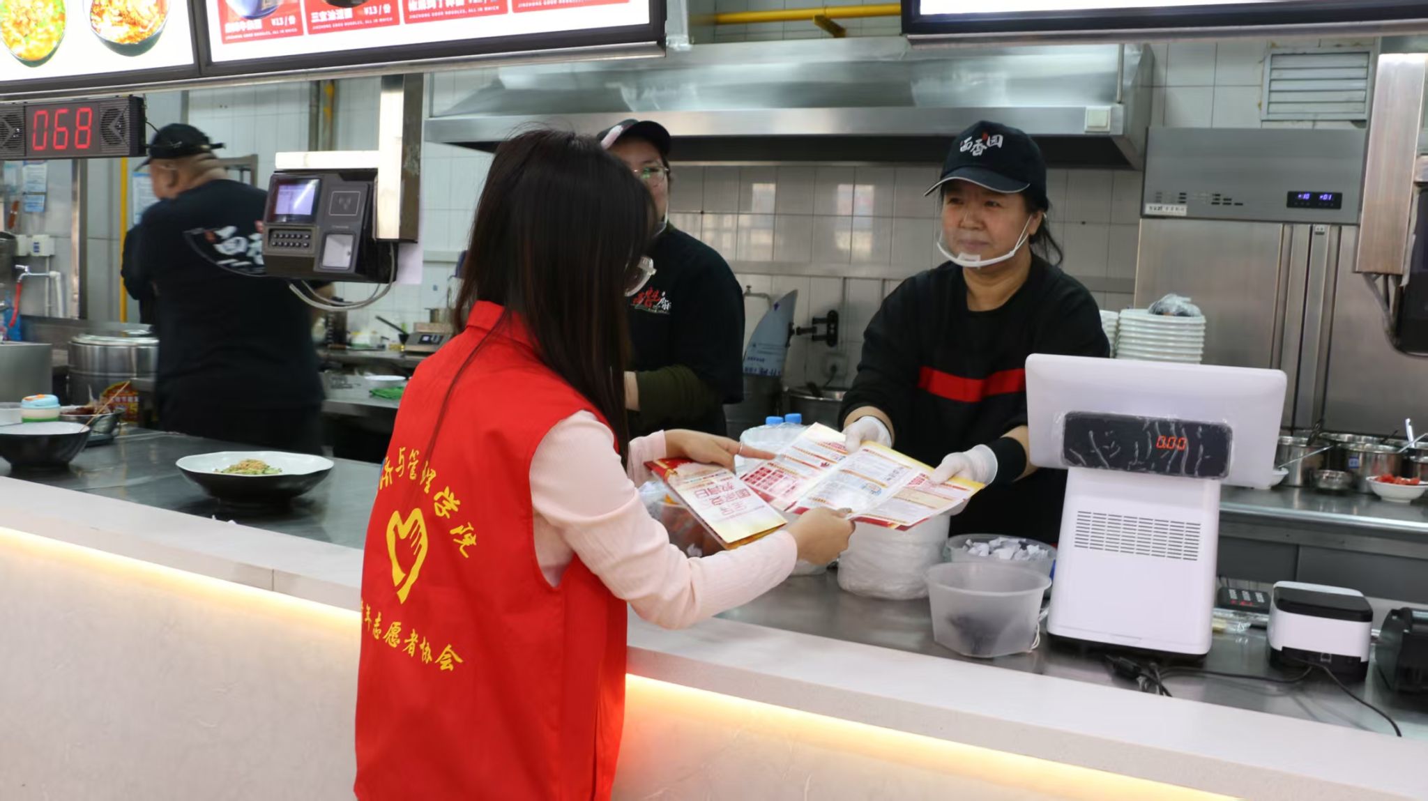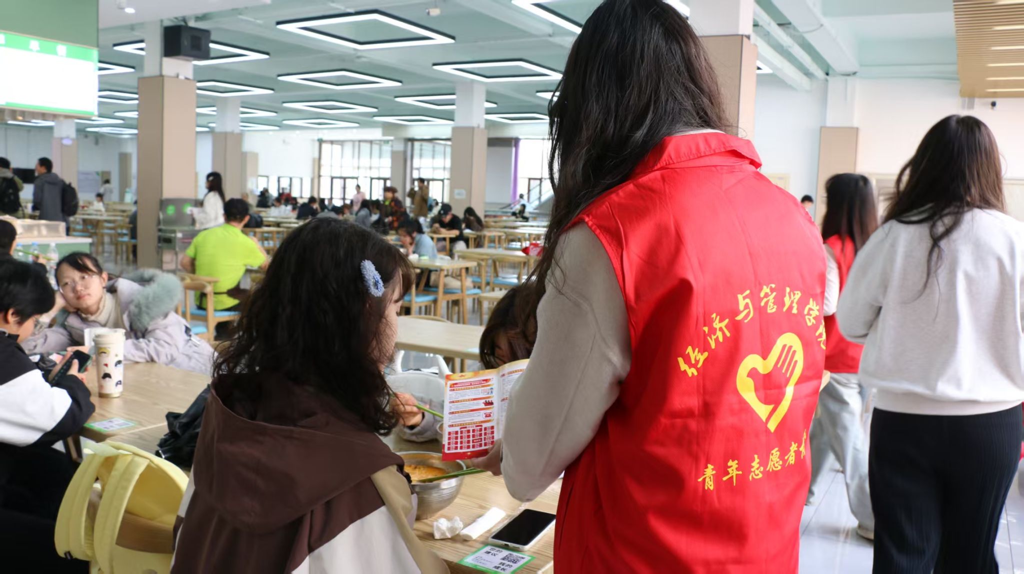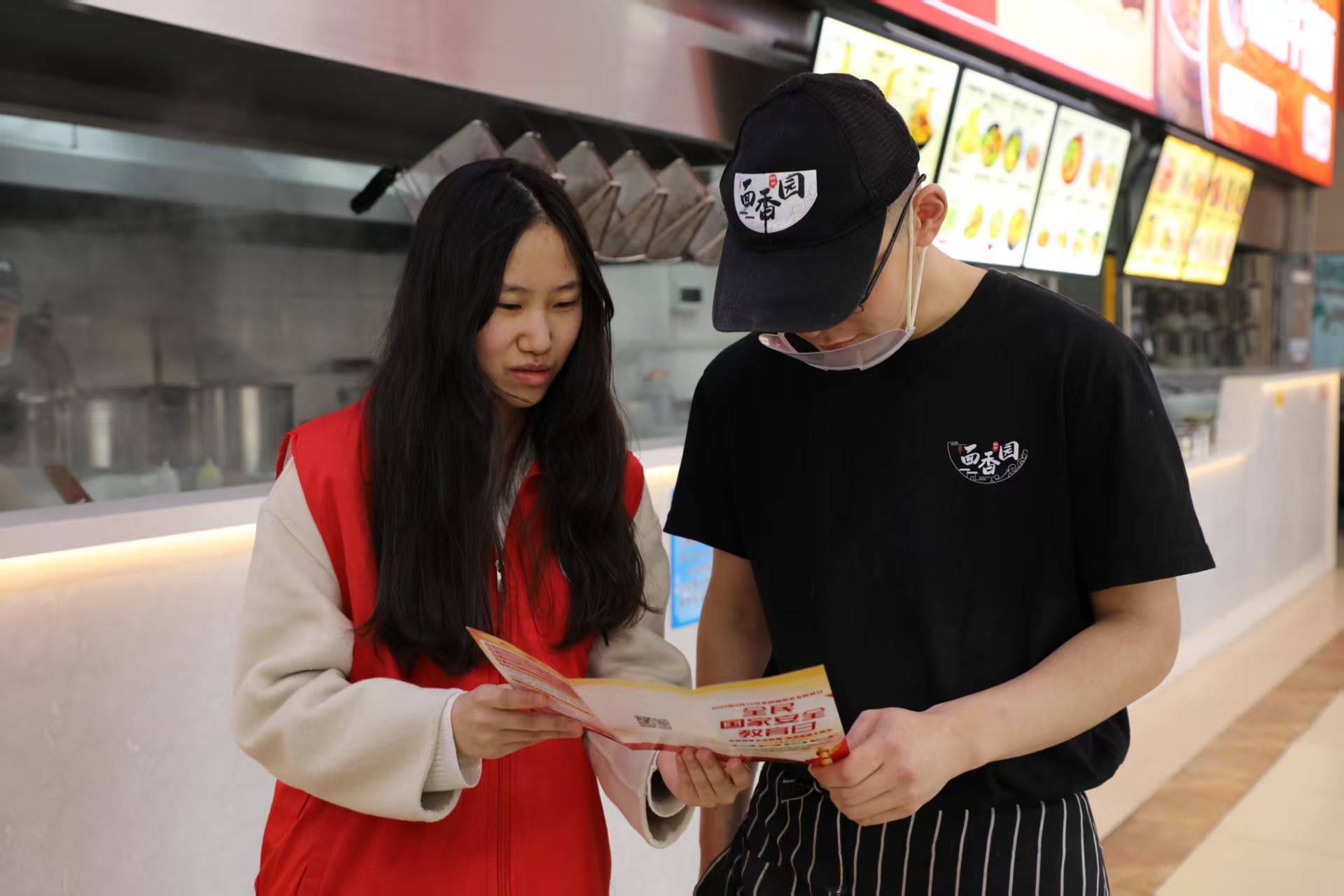 寓教于行,国家安全“走新”更“走心”。志愿者们分为两队分别在校园食堂内外,通过发放国家安全教育日十周年宣传手册的方式向同学们宣传普及国家安全相关知识。“没想到点餐间隙还能学到反诈知识!”一名参与活动的同学感慨到。食堂工作人员也主动加入学习,纷纷表示“国家安全与每个人息息相关,这样的活动很有意义”。