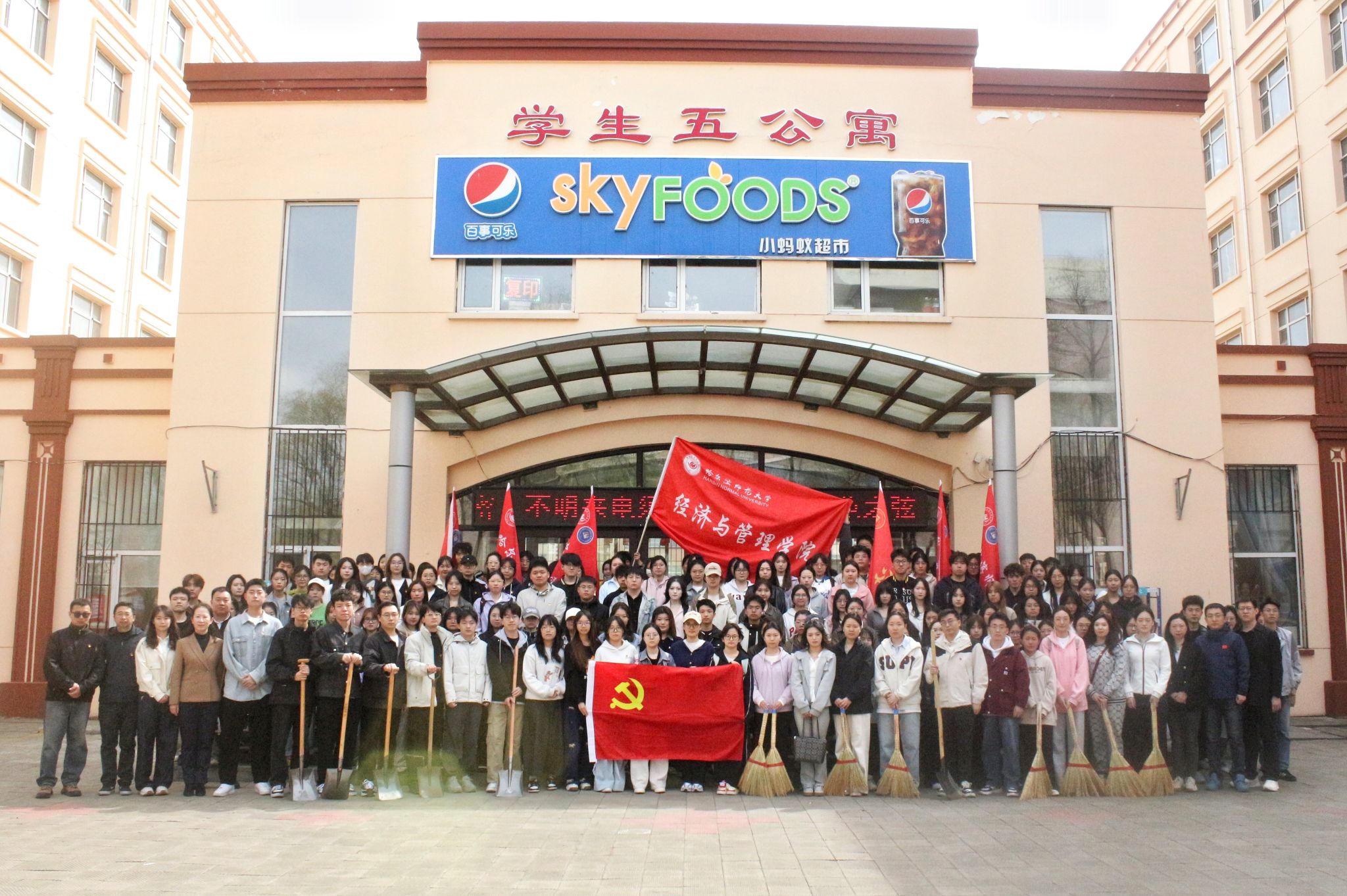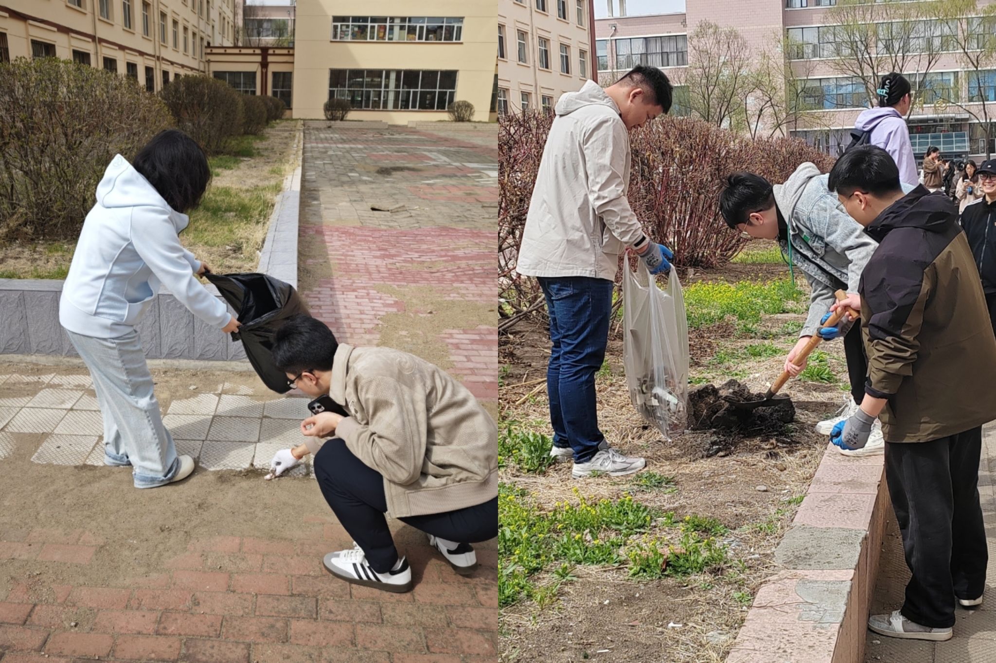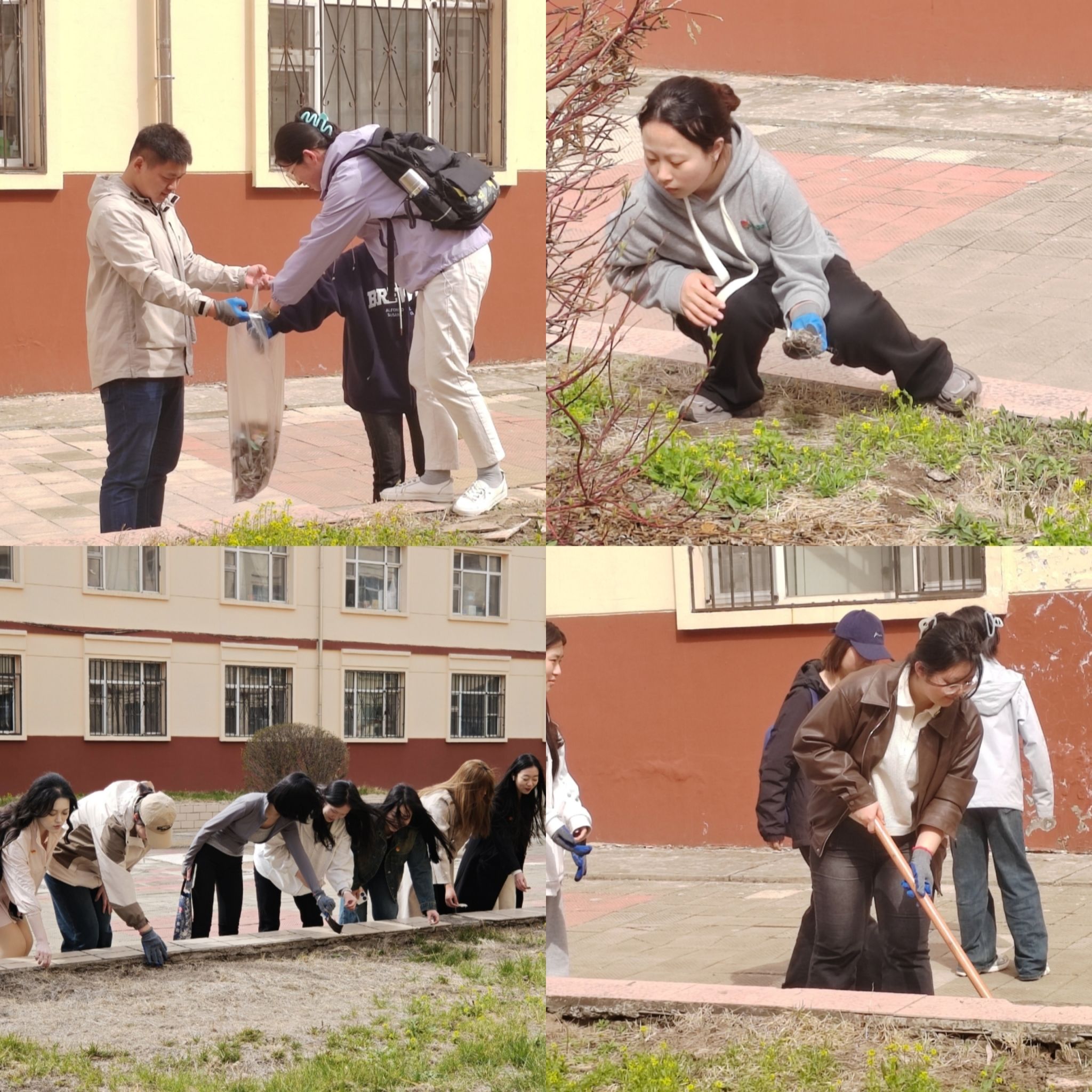 劳动中,各党支部手持劳动工具,默契配合,以学生第五公寓为中心展开实践活动。经过师生们的通力合作,公寓区环境显著改善;道路洁净如新,绿化带错落有致,公共区域焕发清爽气象。在弯腰捡拾的往复间,在修剪绿篱的专注中,同学们对"劳动"二字有了具象化认知,不仅感受到劳动艰辛与收获喜悦,更在协作中领悟了团队力量的深刻内涵。