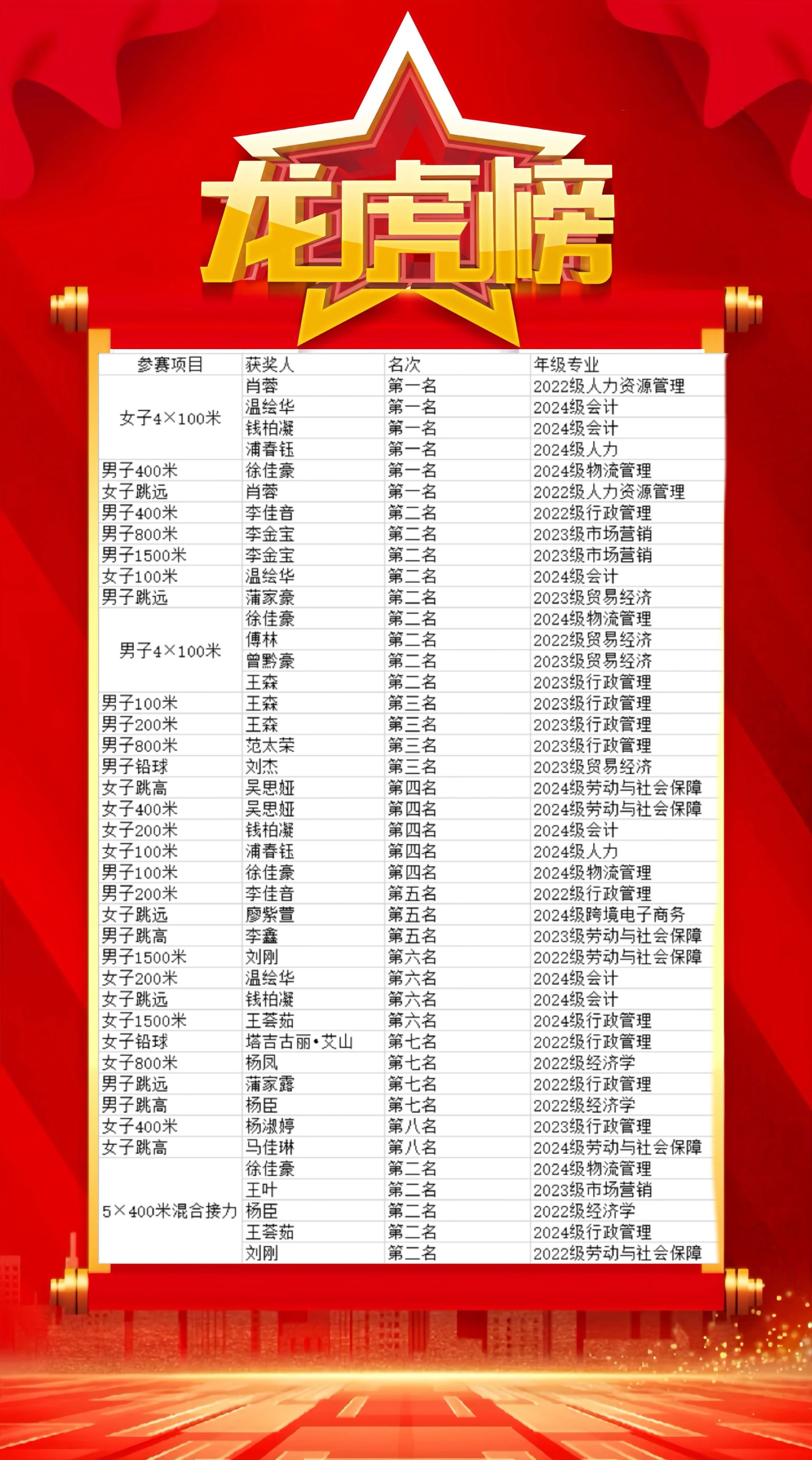 的师生运动员们在赛场上取得了学生团体总分第一名、学生男子团体第一名、教工女子团体第二名、学生女子团体第二名、教工男子团体第四名、教工拔河第四名的优异成绩。在这片充满激情与活力的赛场上,每一位运动员都如同璀璨星辰,用汗水与坚持书写着属于自己的辉煌篇章。他们不仅展现了卓越的竞技水平,更彰显了顽强拼搏的体育精神。他们用实力证明了自己,用成绩为学院争光。今天,就让我们一同走进这场体育盛宴,领略那些在赛场上奋力拼搏的运动员们的风采,编织一幅动人心弦的运动员龙虎榜。