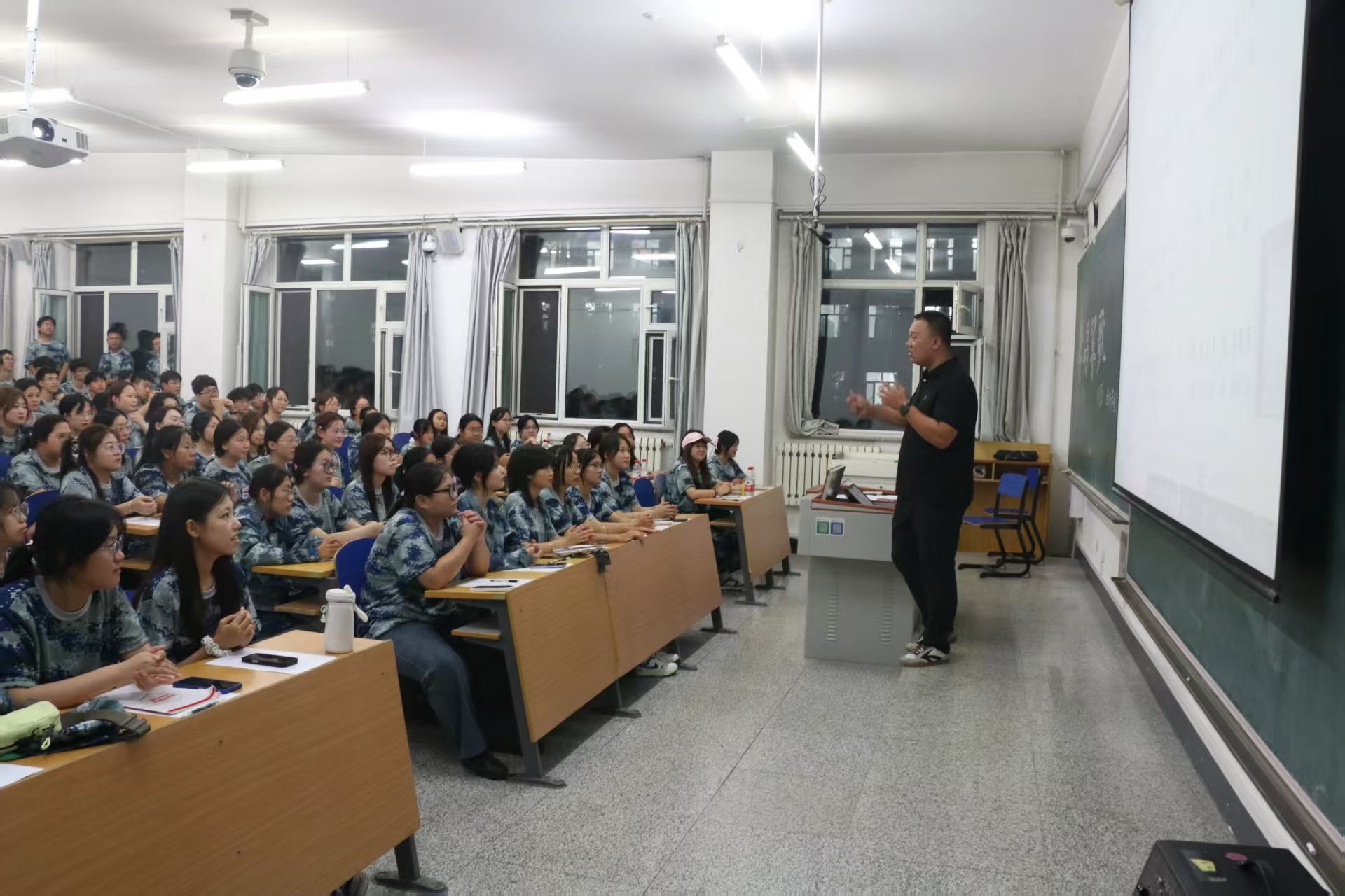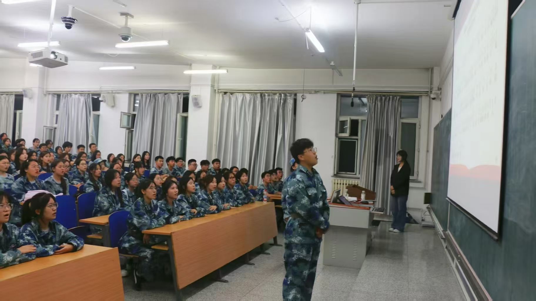 于9月7日18:30在崇师楼各专业教室组织开展2025级新生“学唱红歌”爱国主义教育活动。此次活动由学院学工办副主任金东旭老师负责,学院2025级新生749人全程参与。
