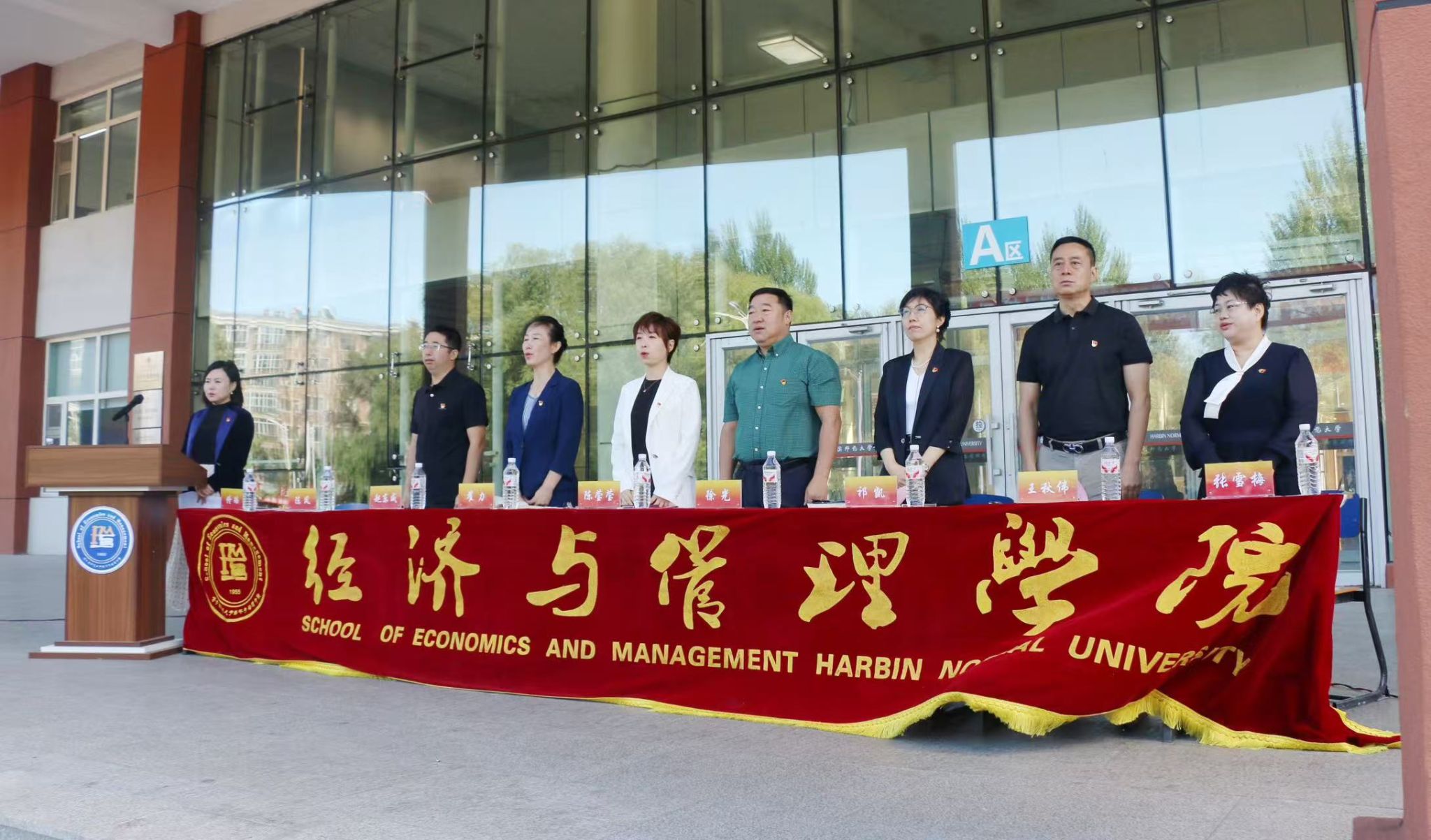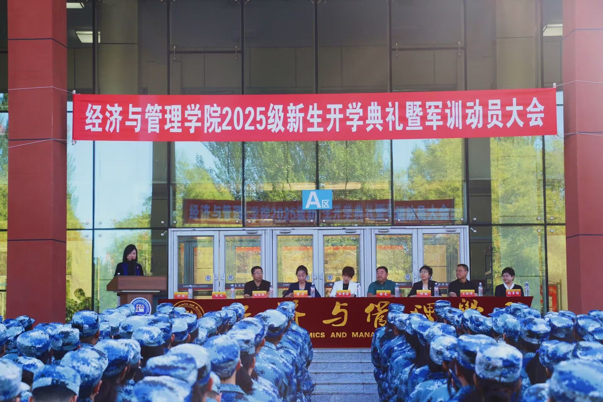 于哈尔滨师范大学江北校区崇师楼A区召开2025级新生开学典礼暨军训动员大会。学院党委书记陈莹莹、院长徐光、党委副书记翟力、副院长祁凯、会计系主任张雪梅、研究生新生辅导员赵东威、本科生新生辅导员王秋伟、陈凤、佟瑶以及884名本硕新生参加本次大会。大会由新生辅导员陈凤主持。