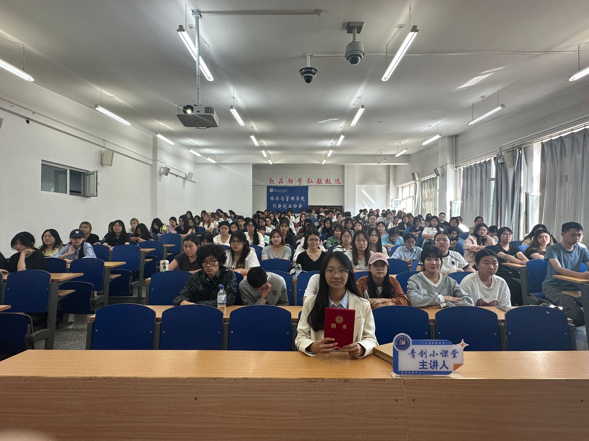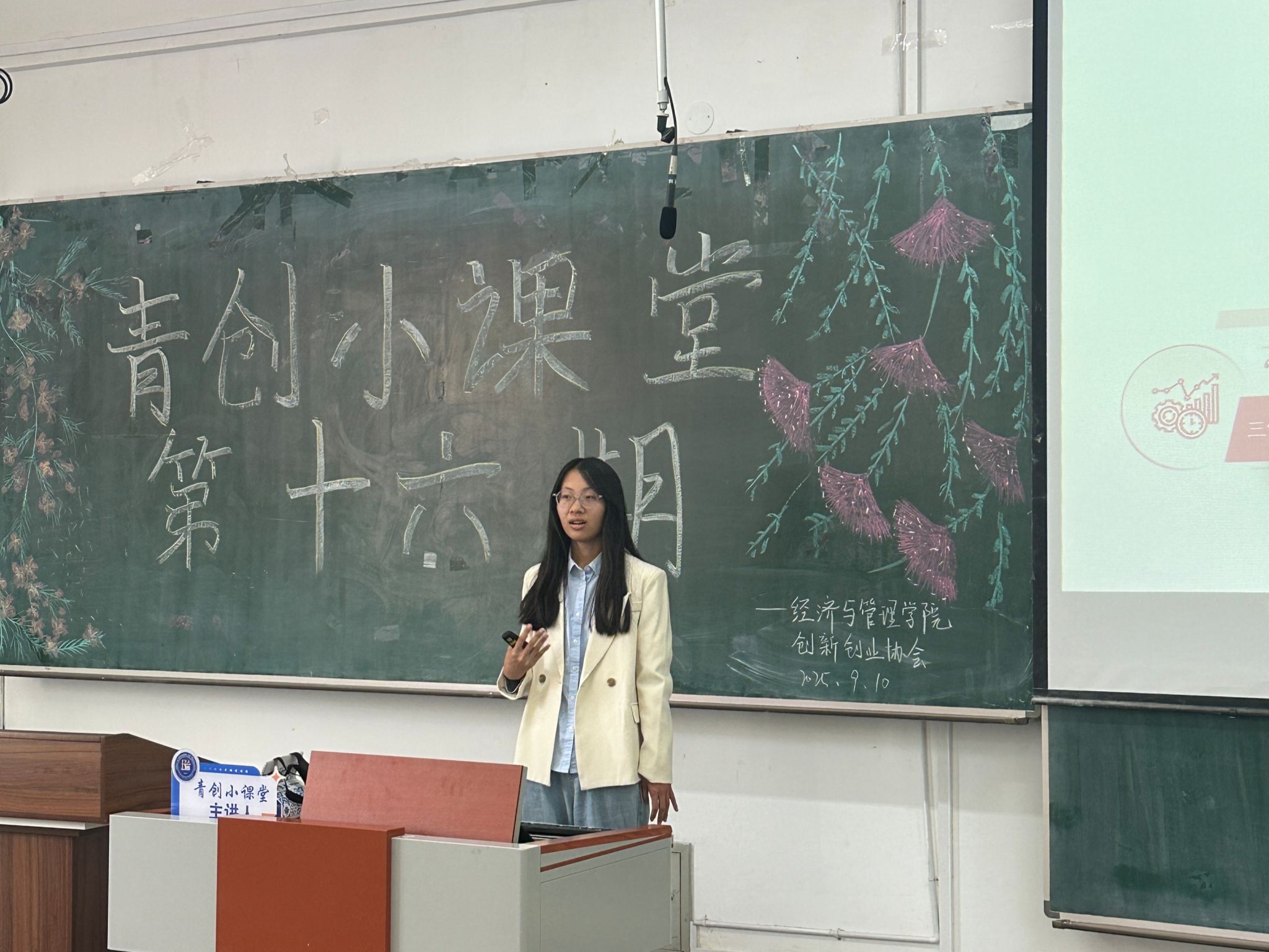创新创业协会于2025年9月10日13:30在崇师楼D202举办“青创小课堂”第十六期讲座。本次讲座邀请文学院2024级汉语言文学专业齐笑晗同学主讲,讲座共有200余名学生参加。