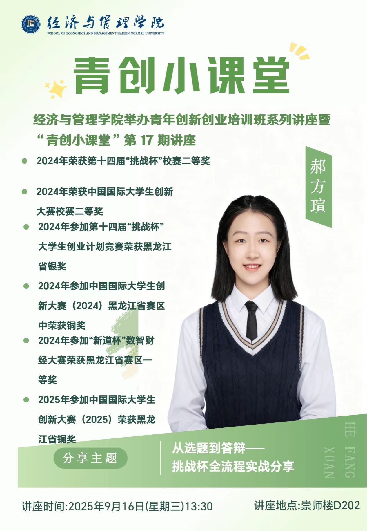 创新创业协会于2025年9月16日在崇师楼D202举办“青创小课堂”第十七期讲座。本次邀请的主讲人是曾获得过多次创新创业大赛奖项的2024级文学院汉语言文学专业的郝方瑄,为大家带来挑战杯创新创业大赛分享会专题讲座。有关事宜如下: