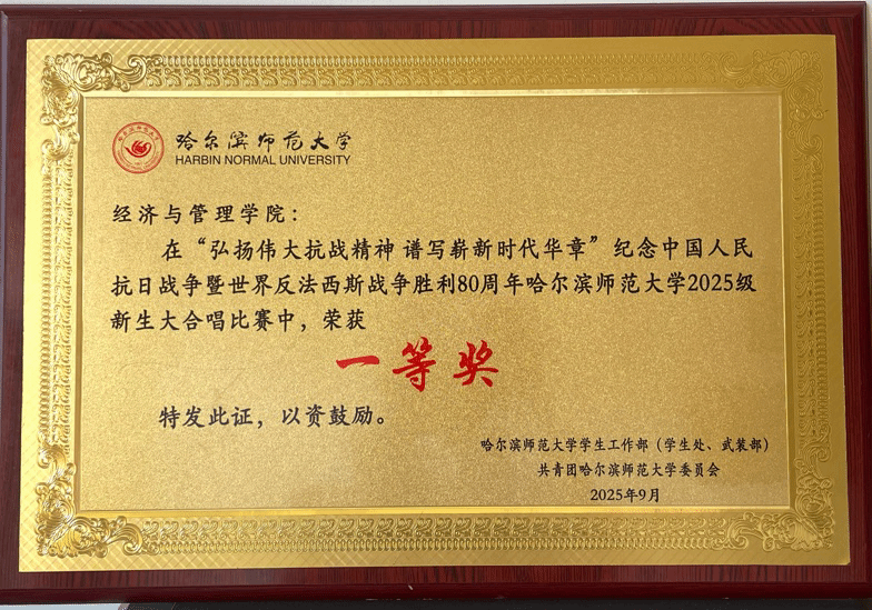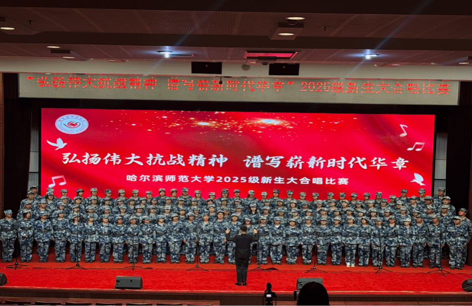 学子以饱满的激情、精湛的演唱和深情的演绎在哈尔滨师范大学“弘扬伟大抗战精神,谱写崭新时代华章”纪念中国人民抗日战争暨世界反法西斯战争胜利80周年2025级新生大合唱比赛中荣获一等奖。