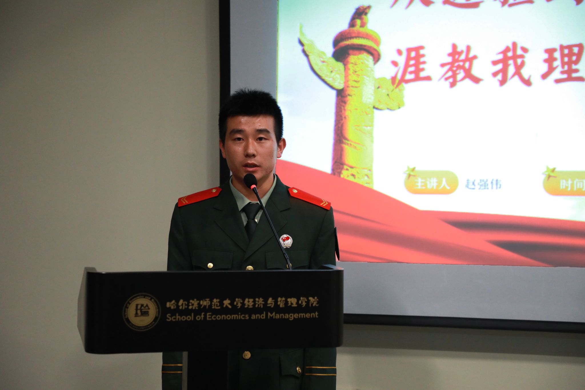 会上,退役大学生士兵赵强伟分享了在新疆服役期间,与少数民族共筑战友情、守护边疆的动人故事。他强调,民族团结是国家安全的基石,呼吁同学们珍惜大学时光,发扬团结互助精神,携手共进,为中华民族伟大复兴努力读书。