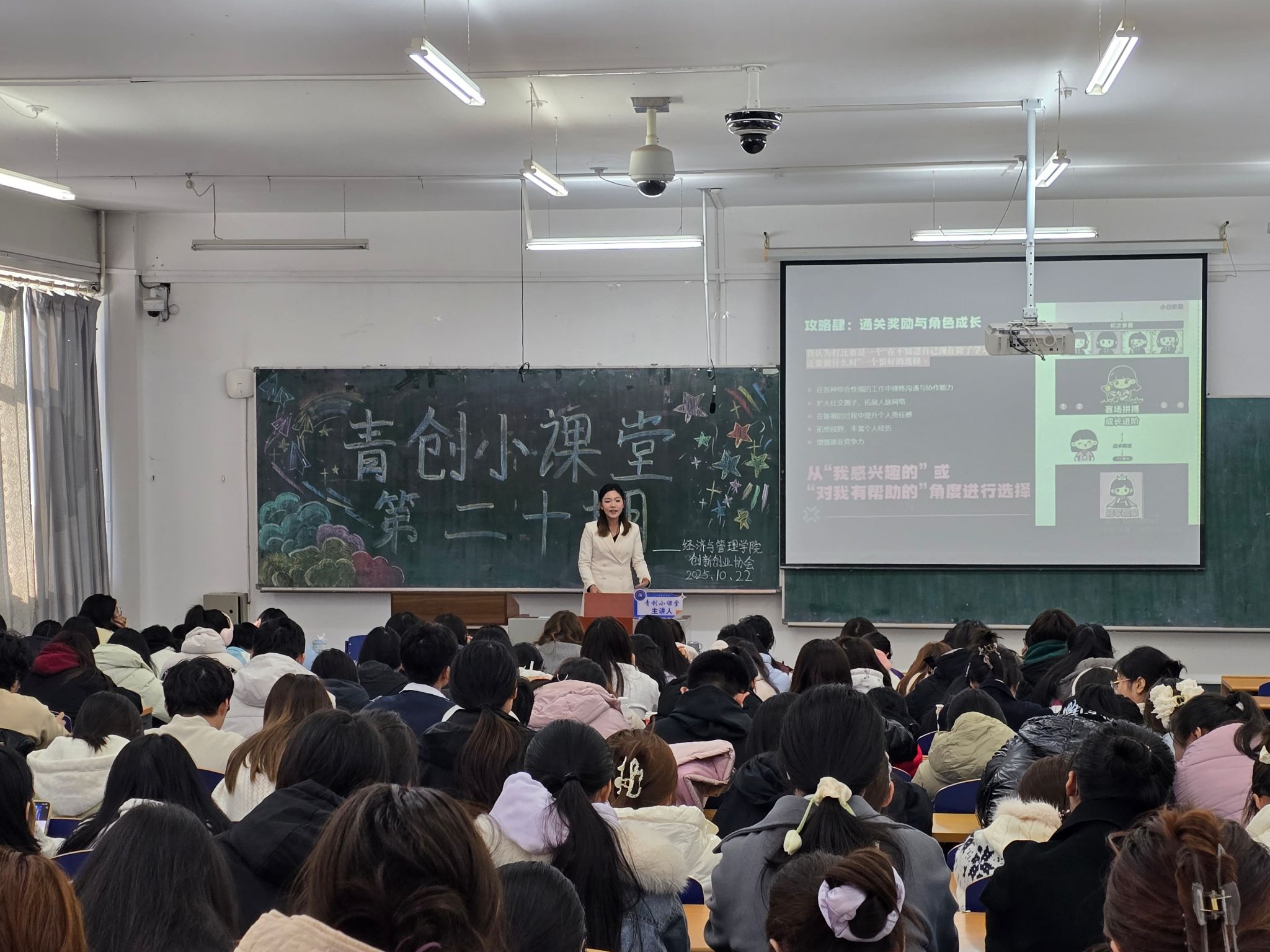 主讲人黄朵扬以“解锁大学玩法新方式之大赛通关篇经验分享会”为主题,向同学们分享了从迷茫焦虑到积极行动,将个人兴趣与大学竞赛实践紧密结合的成长历程。她强调,通过参与“挑战杯”、“国创赛”等高含金量竞赛,不仅能积累经验、丰富简历,更能在实战中提升专业技能与综合能力。同时黄朵扬同学展现了以积极态度为驱动、竞赛实践为舞台,不断突破自我、实现角色成长的大学突破之路,鼓励同学们积极参加学术竞赛、专业实践和志愿公益活动,以培养创新思维和团队协作等综合素质。