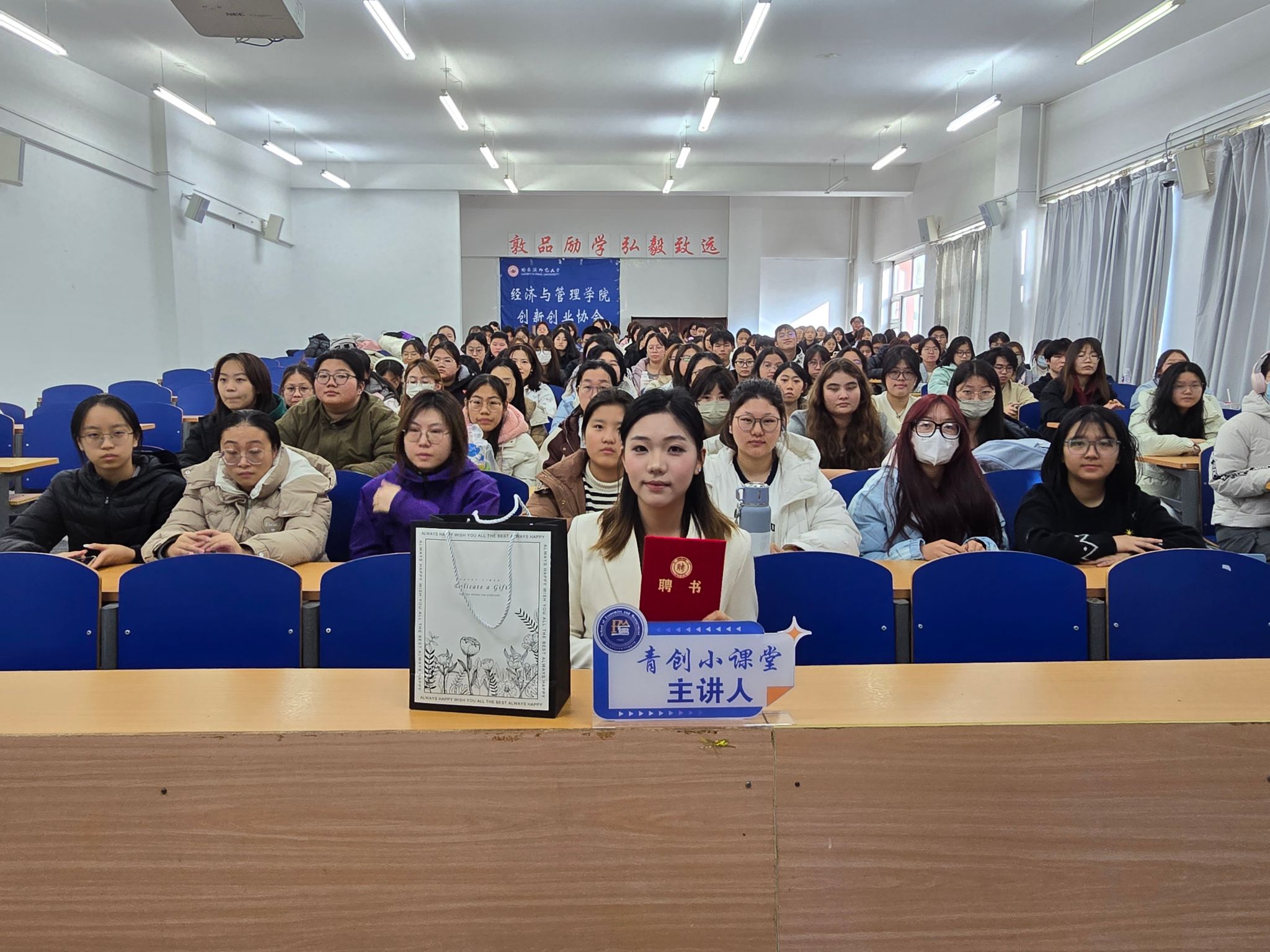 2023级贸易经济专业黄朵杨同学主讲,讲座共有200余名学生参加。