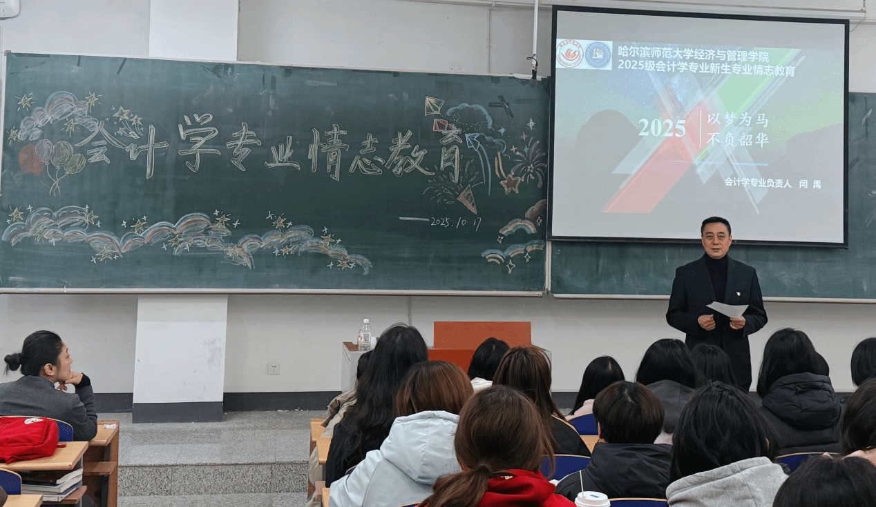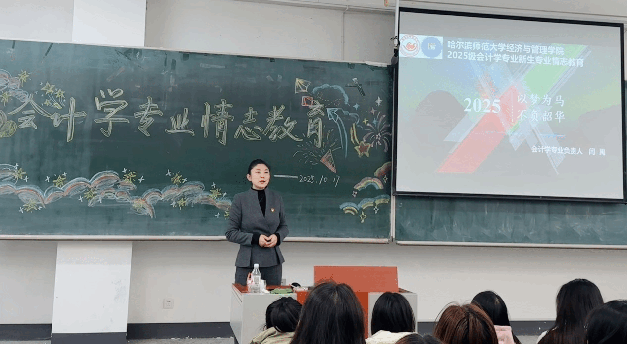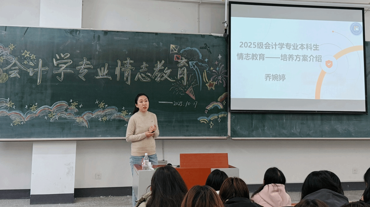 于10月17日14:00在崇师楼C201召开2025级会计学专业新生专业情志教育大会。本次大会由2025级新生辅导员王秋伟老师主持,会计学专业负责人闫禹老师、会计教研室主任乔婉婷老师主讲,2025级会计学专业全体新生参加。
