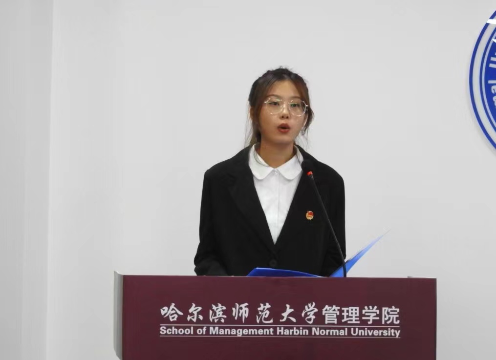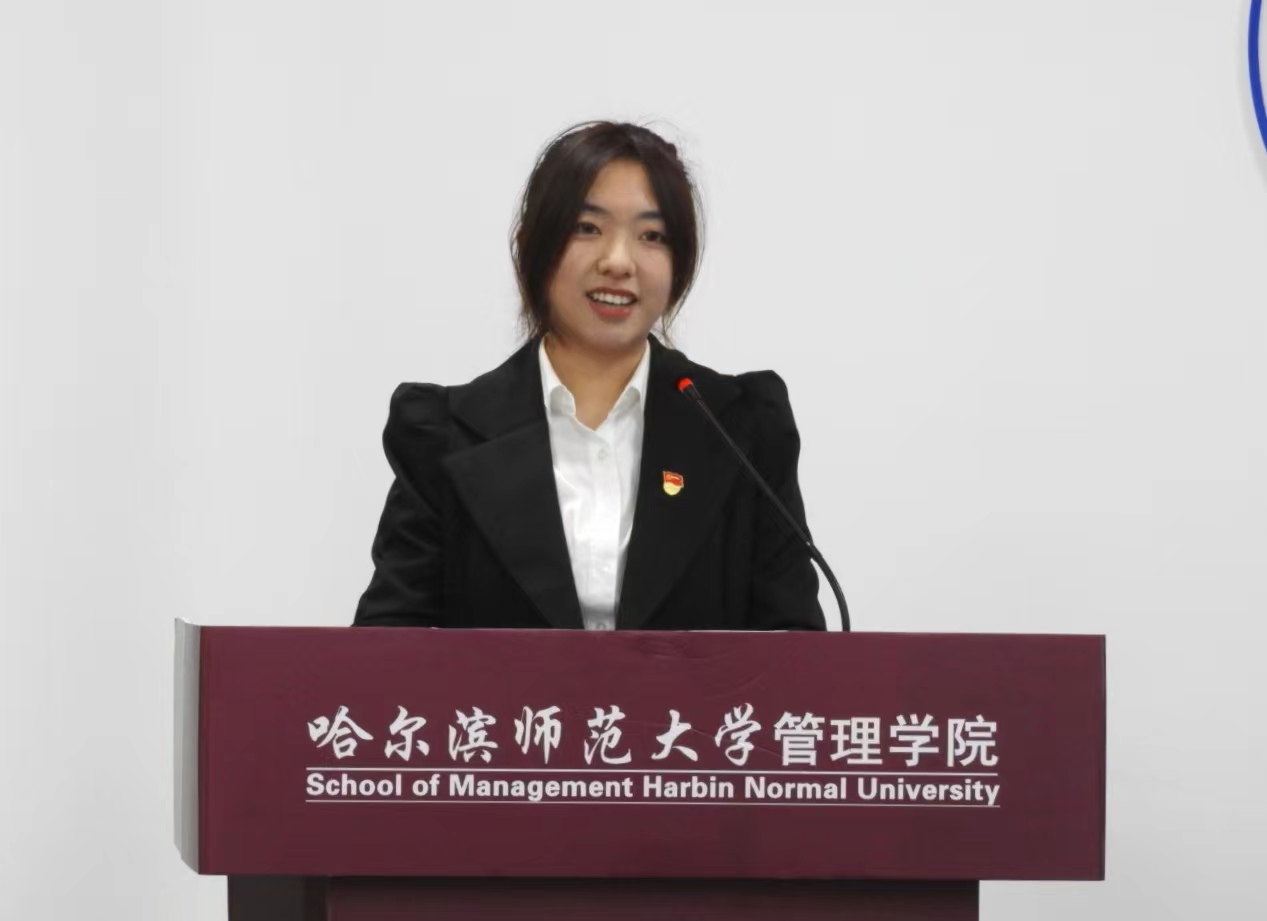 在校生代表、院学生会主席、2020级市场营销专业本科生王镜怡在发言中,以自身经历激励2022级新同学勇往直前去追求平凡中的卓越,扬起胜利的风帆去创造平静中的升华,用自身的魅力去实践青春无悔的诺言,一起伴随哈师大成长,见证属于哈尔滨师范大学管理学院明天的辉煌。