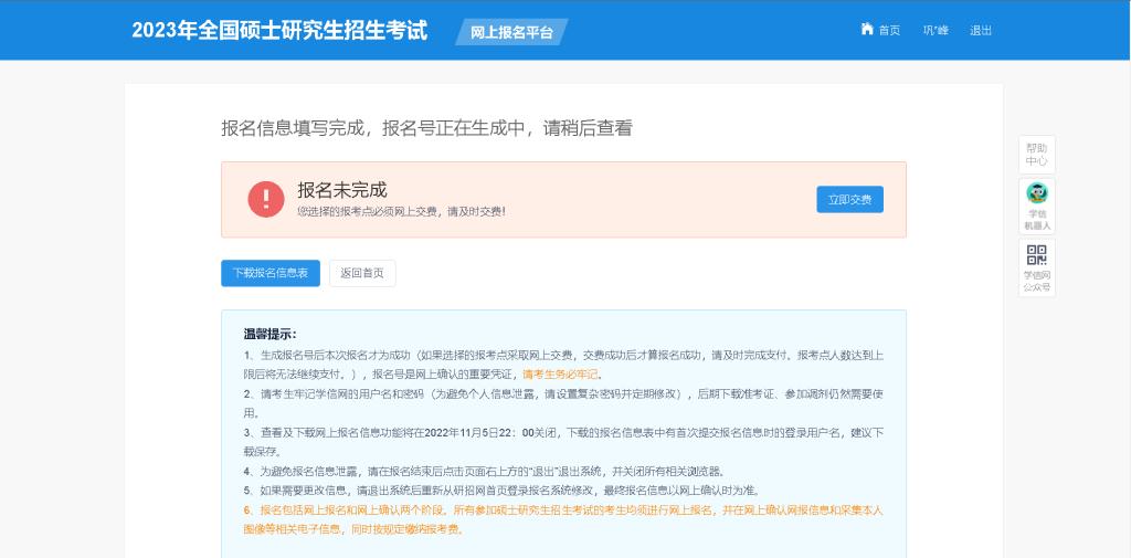 (2)请考生务必于网上报名期间在网上缴纳报考费,最迟须在10月25日22:00前完成网上缴费,后续的网上确认期间一律不再接受补缴费。未缴费的报名信息无效,不能参加考试。