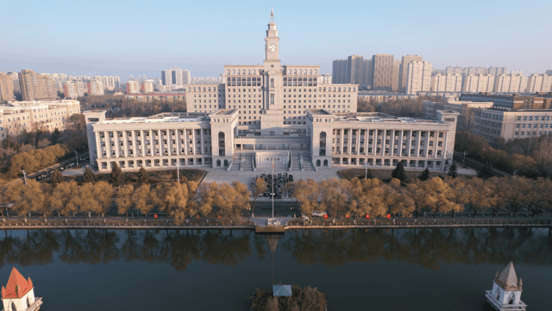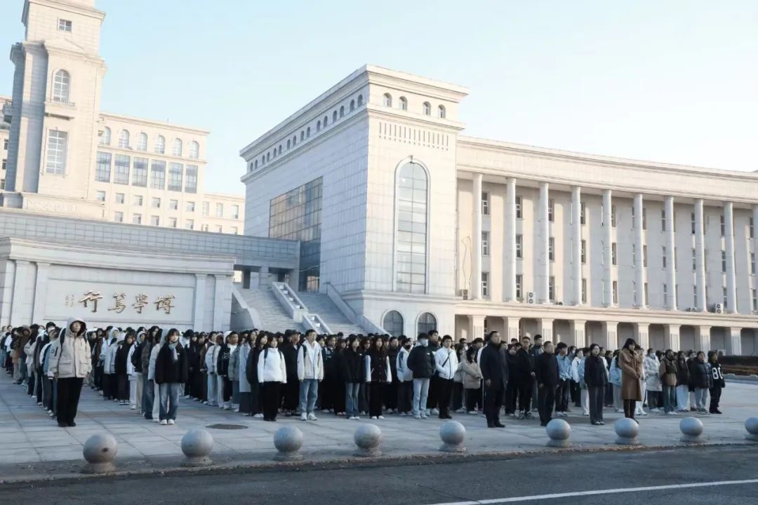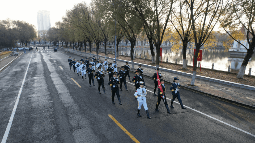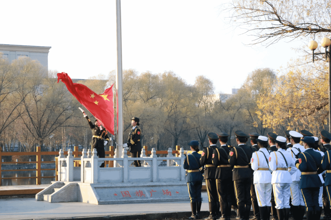 哈尔滨师范大学国旗护卫队出旗。早晨七时整,英姿飒爽的国旗护卫队队员们迈着整齐而有力的步伐出旗,他们身姿挺拔如松,鲜艳的五星红旗在他们肩头闪耀,如同一团燃烧的火焰,向着升旗台进发。