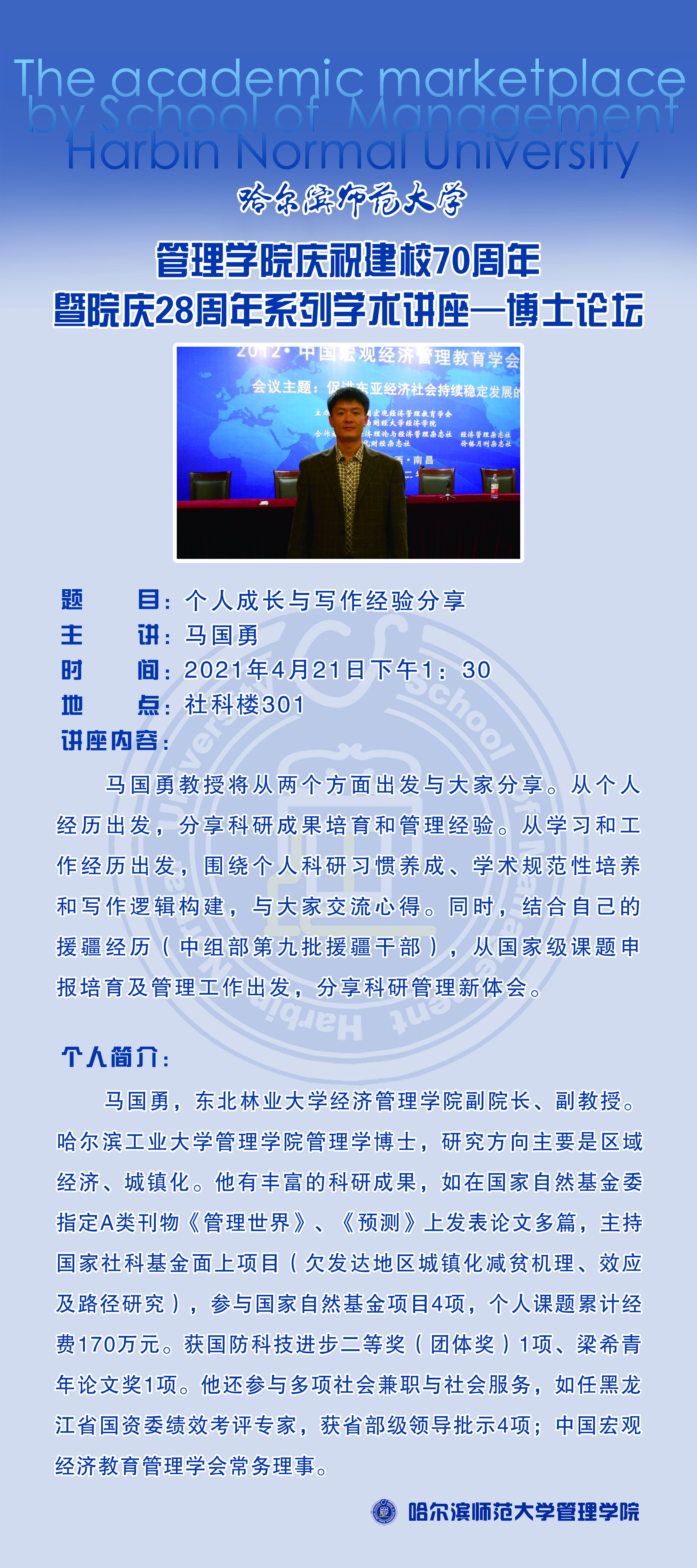 2021年恰逢中国共产党成立100周年,哈尔滨师范大学70周年校庆同时也是管理学院28周年院庆。应管理学院邀请,马国勇教授将于2021年4月21日在足球高清直播在线观看 进行享讲座分享,从学习和工作经历出发,围绕个人科研习惯养成、学术规范性培养和写作逻辑构建,与大家交流心得。同时,结合自己的援疆经历(中组部第九批援疆干部),从国家级课题申报培育及管理工作出发,分享科研管理新体会。欢迎我校师生踊跃参加。