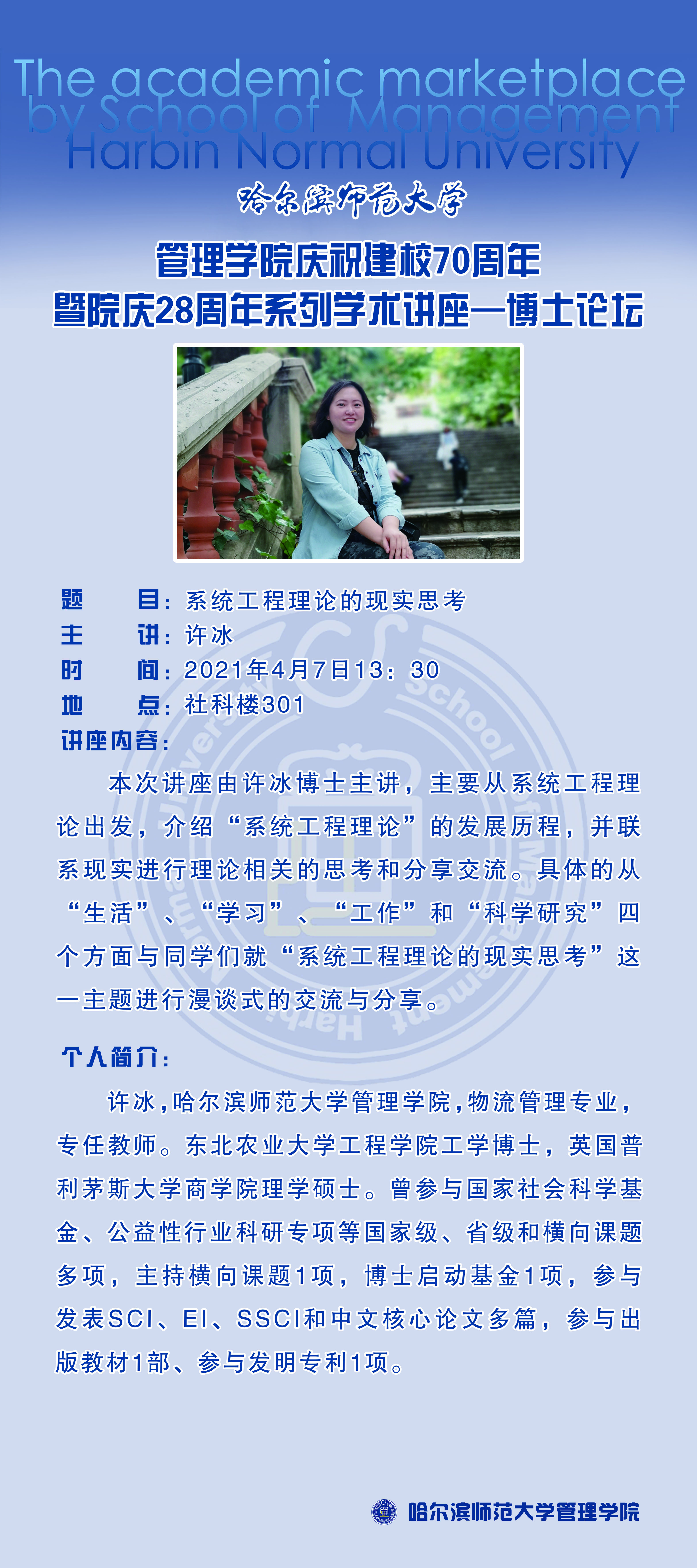 2021年恰逢中国共产党成立100周年、哈尔滨师范大学70周年校庆,同时也是管理学院28年院庆。应管理学院邀请,许冰博士将于2021年4月7日在足球高清直播在线观看 进行“系统工程理论的现实思考”相关讲座报告,欢迎足球高清直播在线观看 师生踊跃参与。具体信息如下: