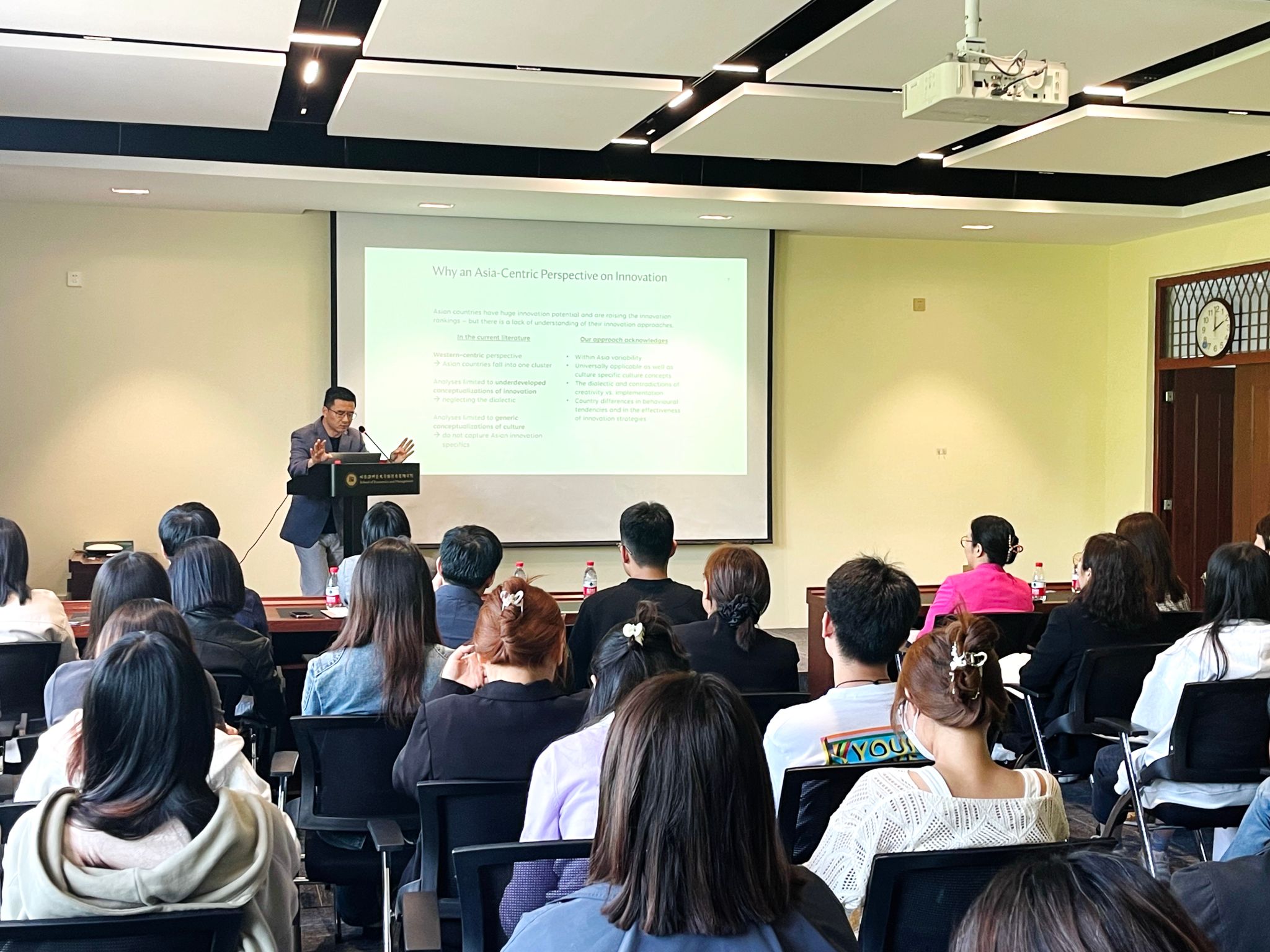 在讲座中,宋照礼先生围绕Asia-centric Management Research on Innovation,对以亚洲中心管理研究在创新领域研究的重要性和巨大潜力进行了深刻剖析。首先,他基于亚洲地区的经济发展和创新环境,明确指出了亚洲在全球创新格局中所占据的独特地位,并着重强调了亚洲中心管理研究在推动区域创新发展中的关键性角色。随后,宋照礼先生分享了自己在亚洲中心管理研究领域的宝贵经验和深刻见解。他详细阐述了如何结合亚洲独特的文化和社会背景,探索出符合亚洲特色的创新管理模式,并进一步探讨了如何将这些研究成果转化为实践,从而有效推动企业和社会的创新发展。通过引用丰富的案例和深入的学术研究,宋照礼先生向足球高清直播在线观看