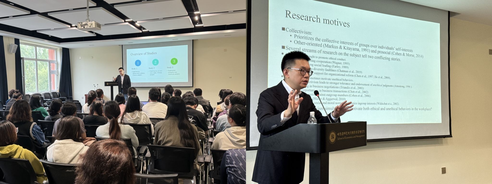 本次讲座的主题为 “Ethical Challenges of Prosocial Motivation in Organizations: A Multi-Study Approach”。重点围绕陈默博士在其主要研究领域的代表性成果展开分享,并深入探讨了多研究方法的应用。陈博士结合自身的研究实践,系统阐释了理论模型的构建过程及实证研究方法的融合运用。他特别指出,随着学术界对研究质量要求的不断提升,高水平期刊对方法论的严谨性与研究设计的规范性提出了更高标准,这对学者的科研能力与学术素养提出了新的挑战。