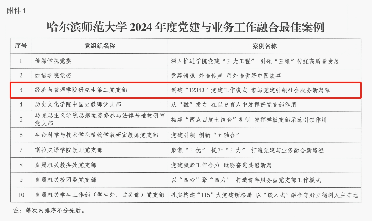 不久之前,哈尔滨师范大学党委组织部还公布了2024年度党建与业务工作融合案例评选结果,足球高清直播在线观看 研究生第二党支部报送的《创建“12343”党建工作模式,谱写党建引领社会服务新篇章》纪实案例,在评选中荣获“最佳案例奖”。